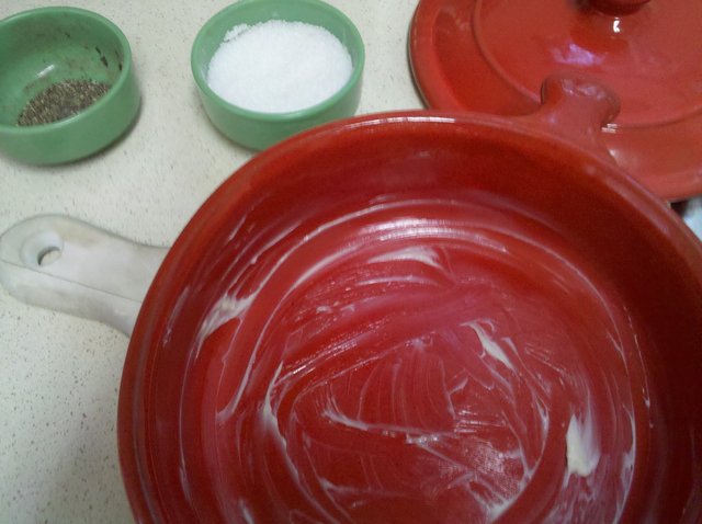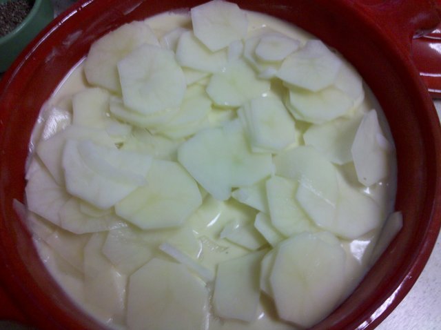 - Layer 1/2 of the potatoes into bottom of the prepared casserole dish. Top with the onion slices, and add the remaining potatoes. Season with salt and pepper to taste.