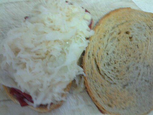 Add warm saurkraut on top of meat & cheese , place other slice of bread in top of that. Slice in half. Enjoy!