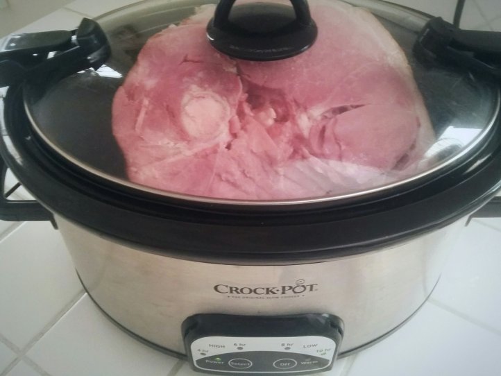 Score outside of ham into diamond shapes (if unsliced) and place in crock-pot. Add about 2 cups of water to bottom of pot. Heat on high, for about 3 hours, until heated through.