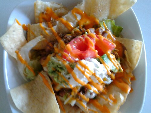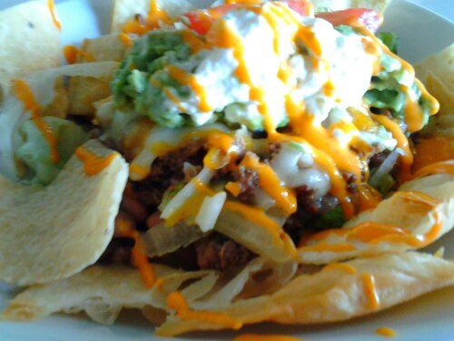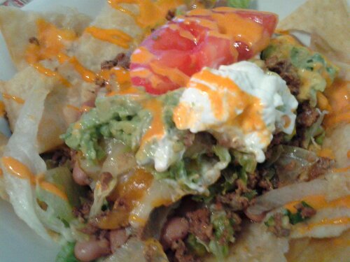 Crispy homemade tortillas (I’m in an area that’s steeped in Mexican culture….abundant authentic ingredients), seasoned ground beef, beans (I use ranch style. I personally dislike taste of black beans. If its due to what’s available, I’ll use refried beans or chili! Yumm), shredded cheese, lettuce, tomato. Sour cream, guacamole & dressing for topping.