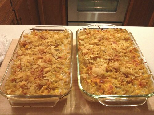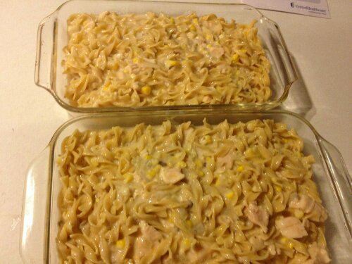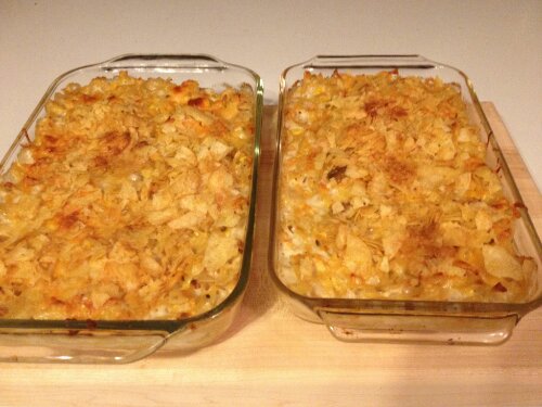 Place into a lightly greased 2 quart baking dish. Top the casserole with shredded Colby jack cheese and buttery crackers or choice for crispy topping. Place into the oven and bake at 350 degrees for about 30 minutes, or until heated through and browned on top.