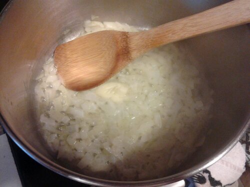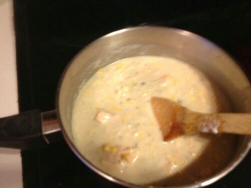 Add butter to deep sauce pan/pot (remember I doubled this). Saute onions until translucent. Add other veggie if using. I added corn.