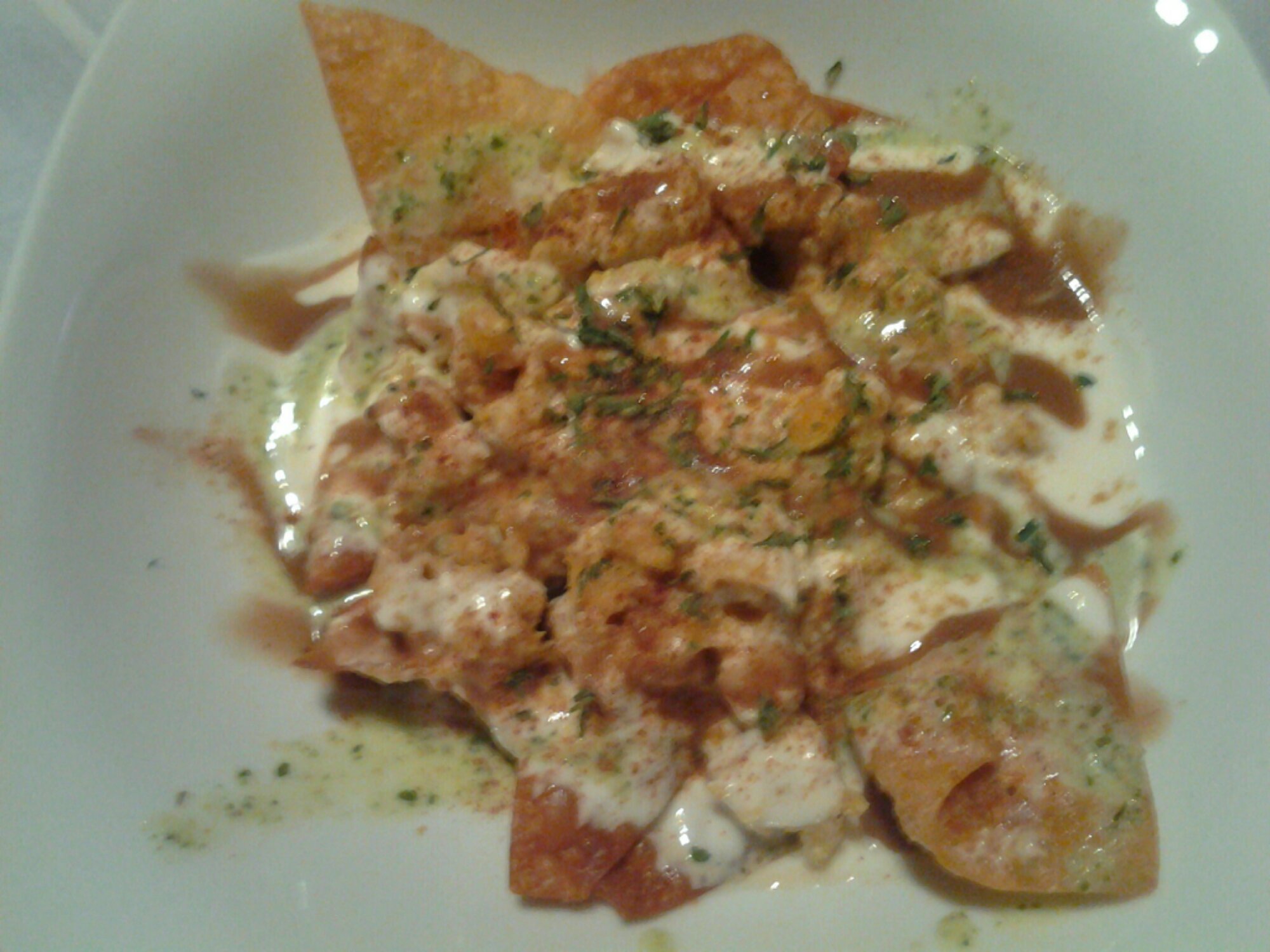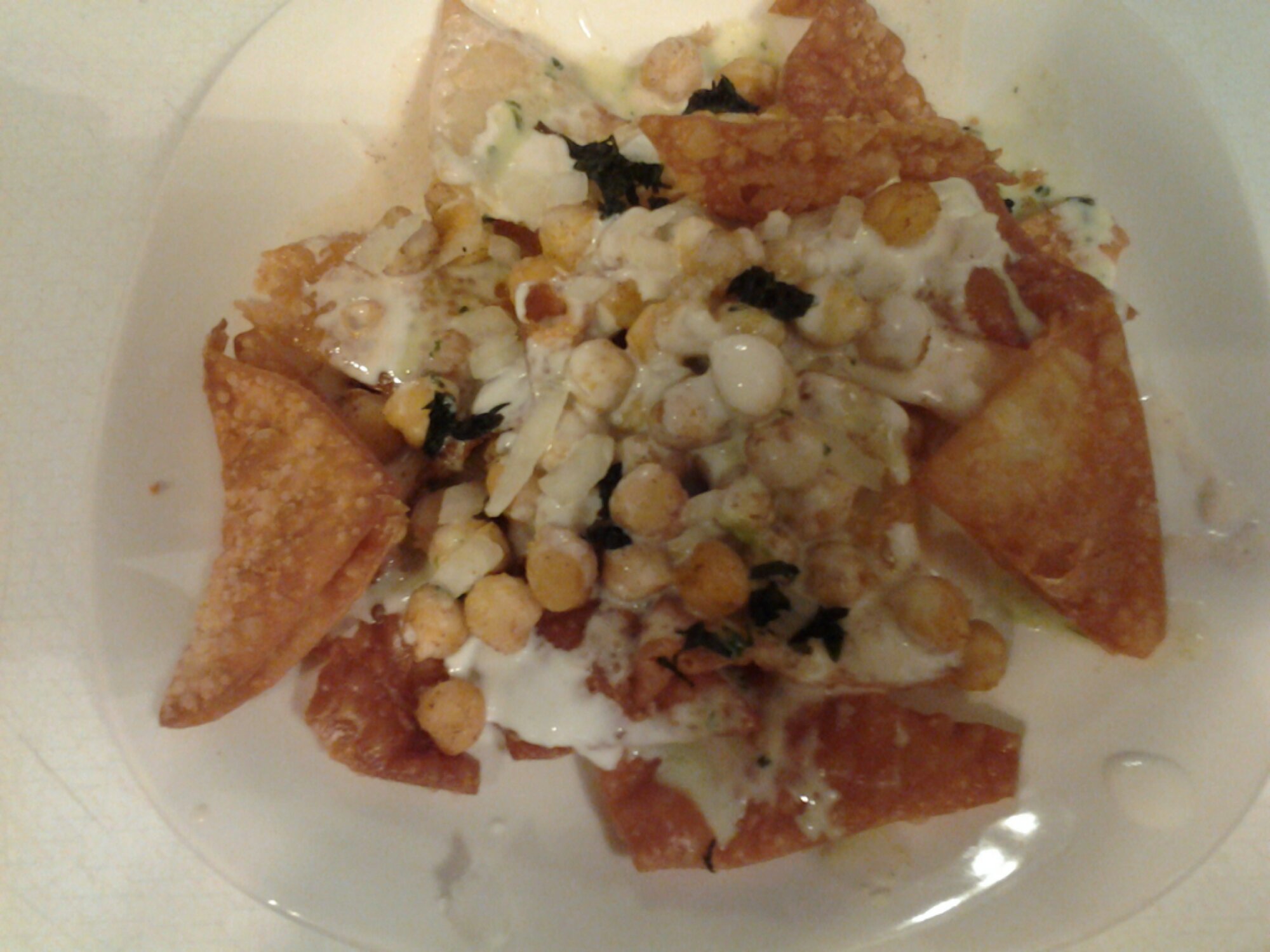 -In a shallow glass dish, lay a layer of 2 cups of papri, then chickpeas, then potatoes…