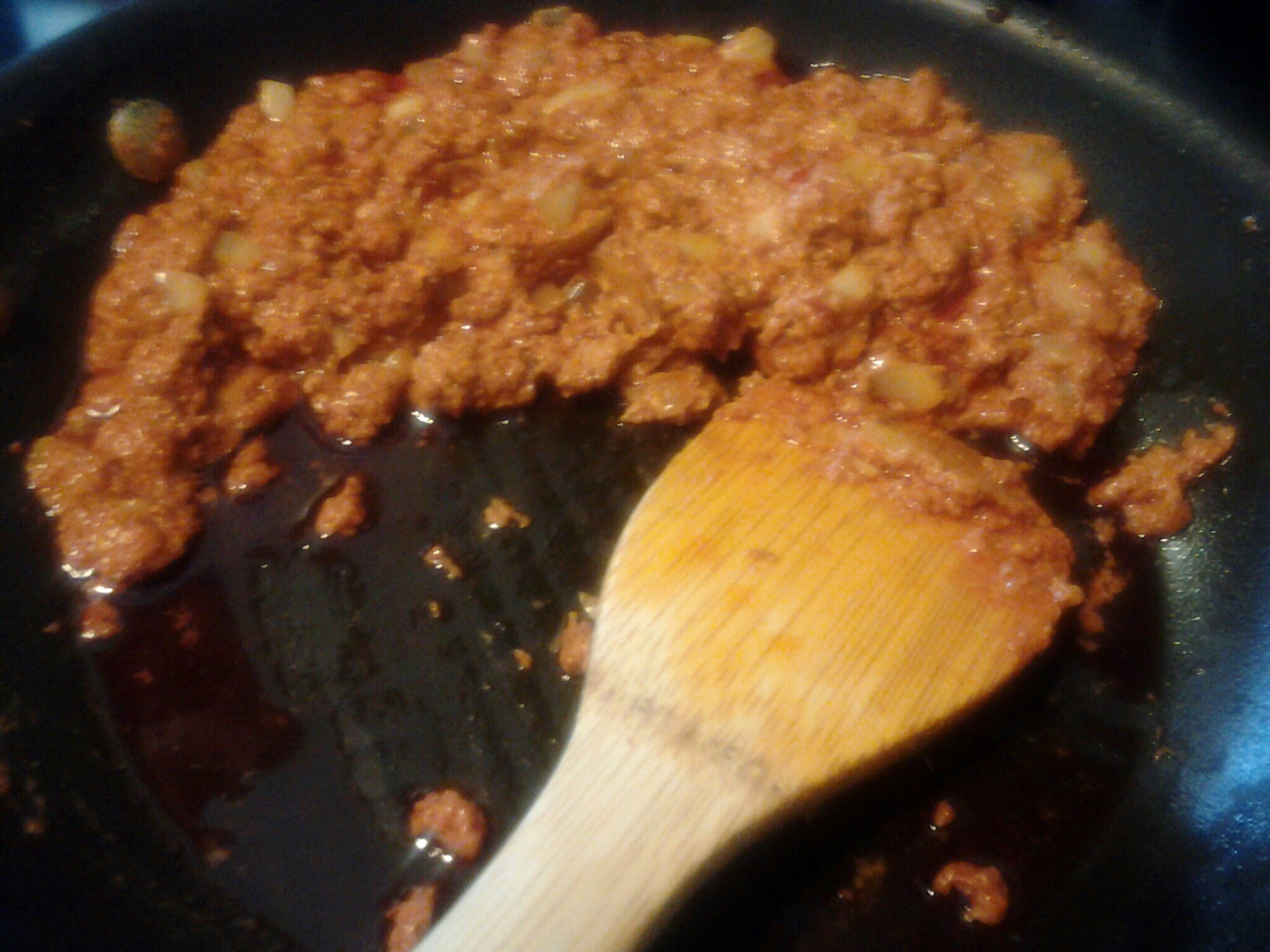 Saute onions the chorizo and cook over medium heat, stirring with a wooden spoon, until oils begin to release and sausage starts to crisp up.