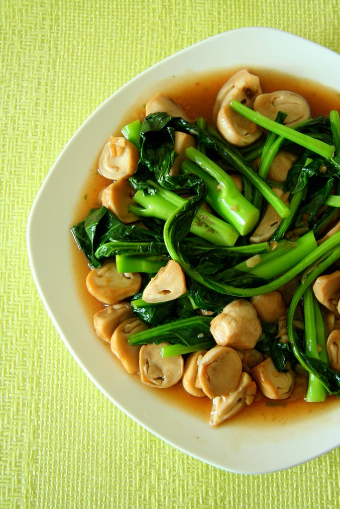A leafy vegetable with thick stems, glossy leaves of a dark green shade and vestigial yellow flowers, Chinese kale, or Chinese broccoli, is very popular in Asian cooking. It goes well with many vegetables, such as shiitake mushrooms, crispy pork belly and salted fish. Chinese kale is probably one of best vegetables for stir-frying and gives confidence to an amateur cook like me. I love to rinse Chinese kale under running water, as rubbing the leaves’ leathery textures remind me of water droplets bouncing off lotus leaves.
