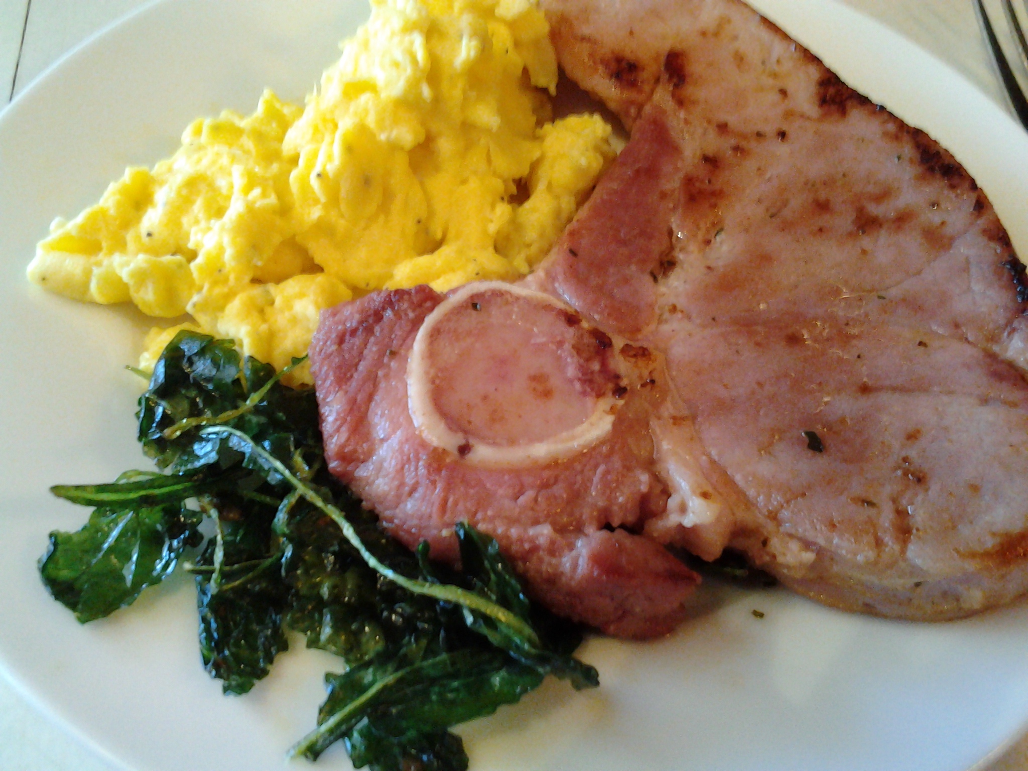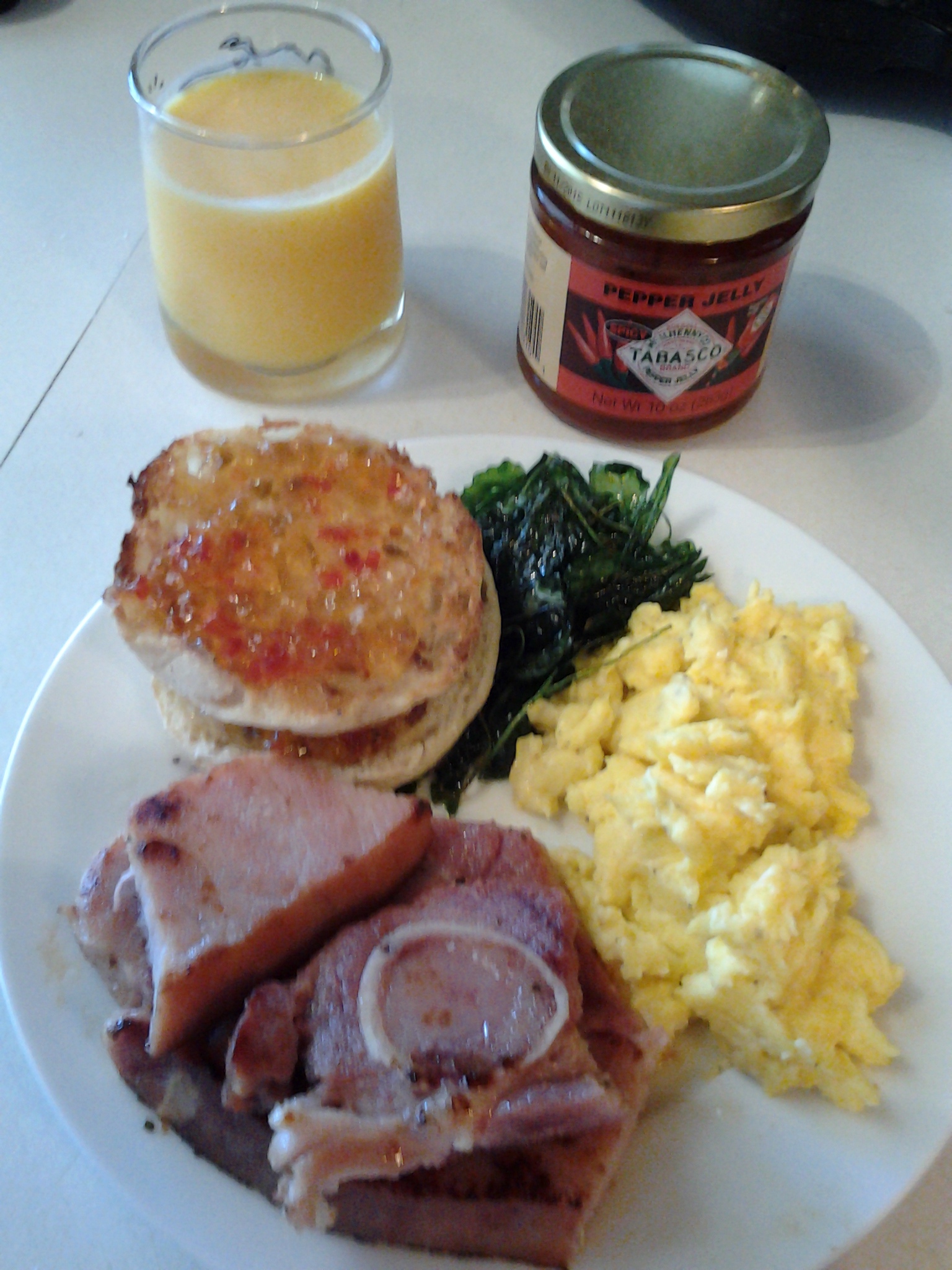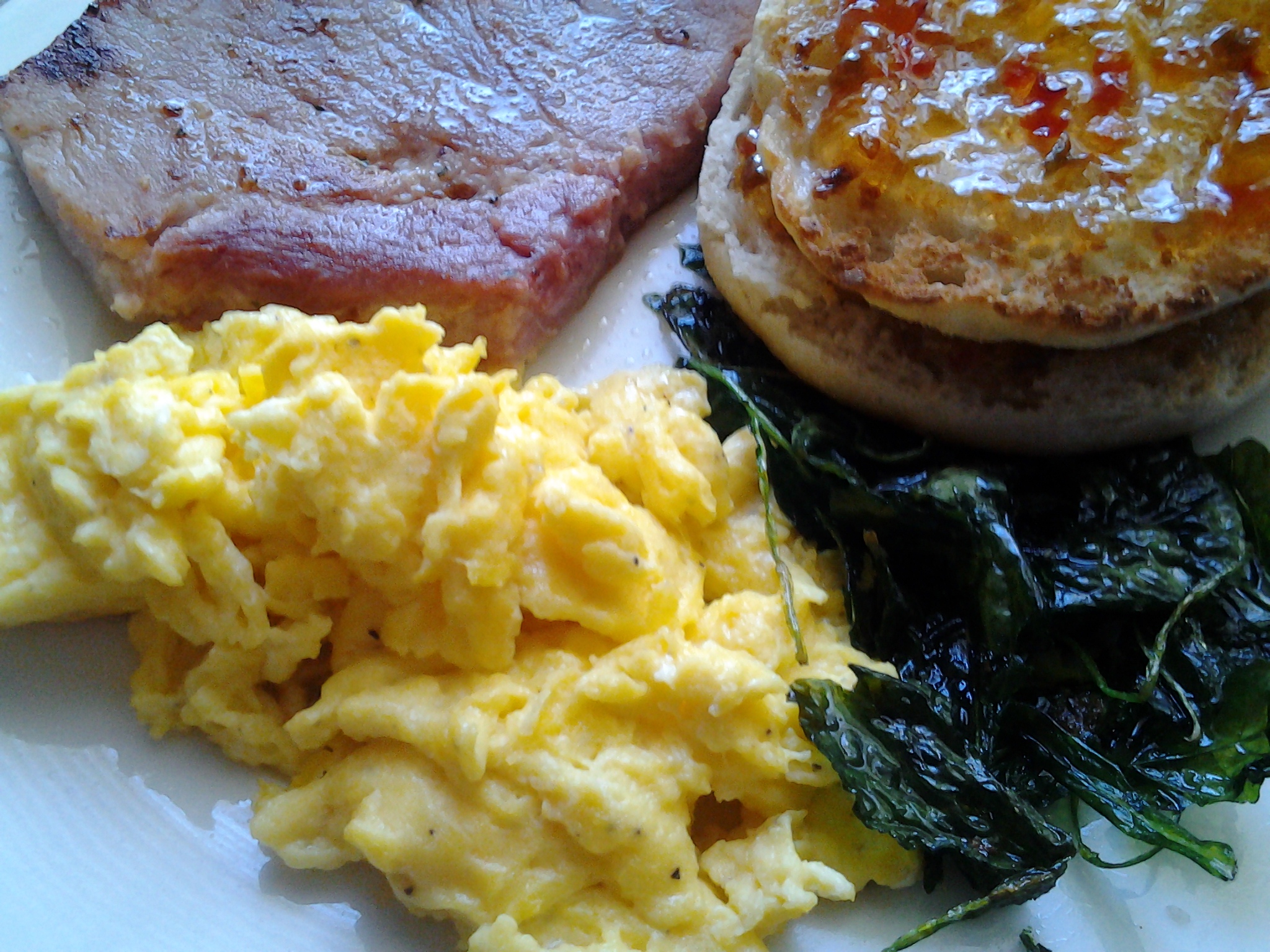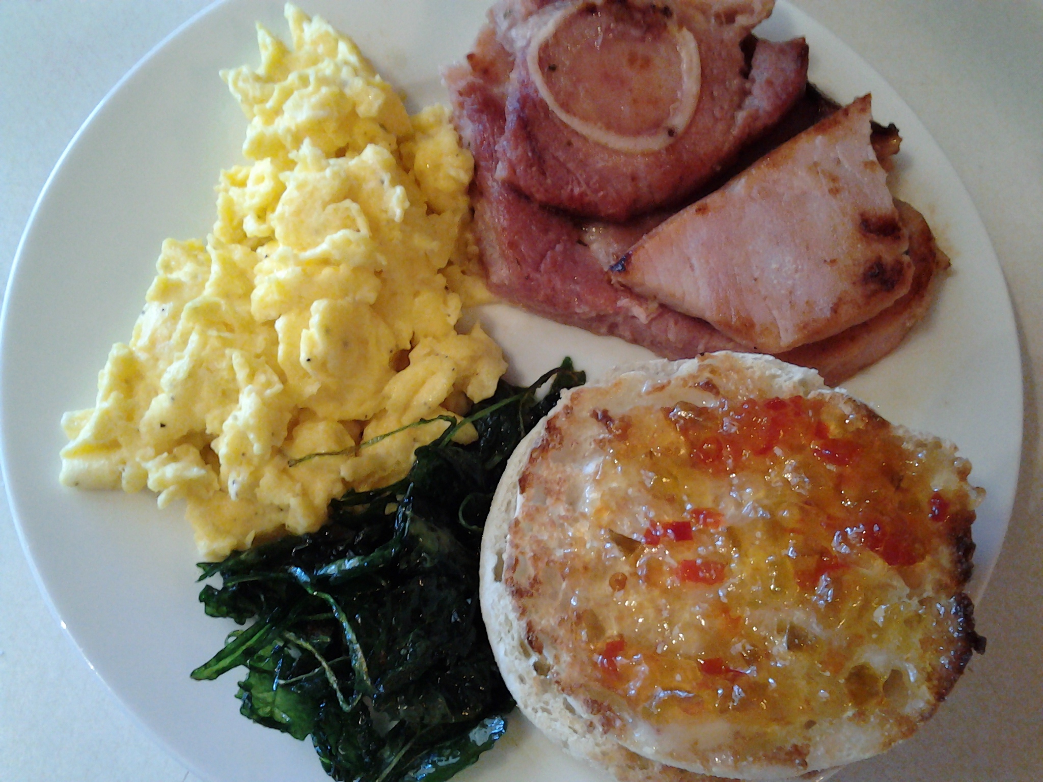 Scrambled eggs, ham steak, crispy baby kale w/smoked sea salt & toasted English muffin w/red pepper jelly 😀