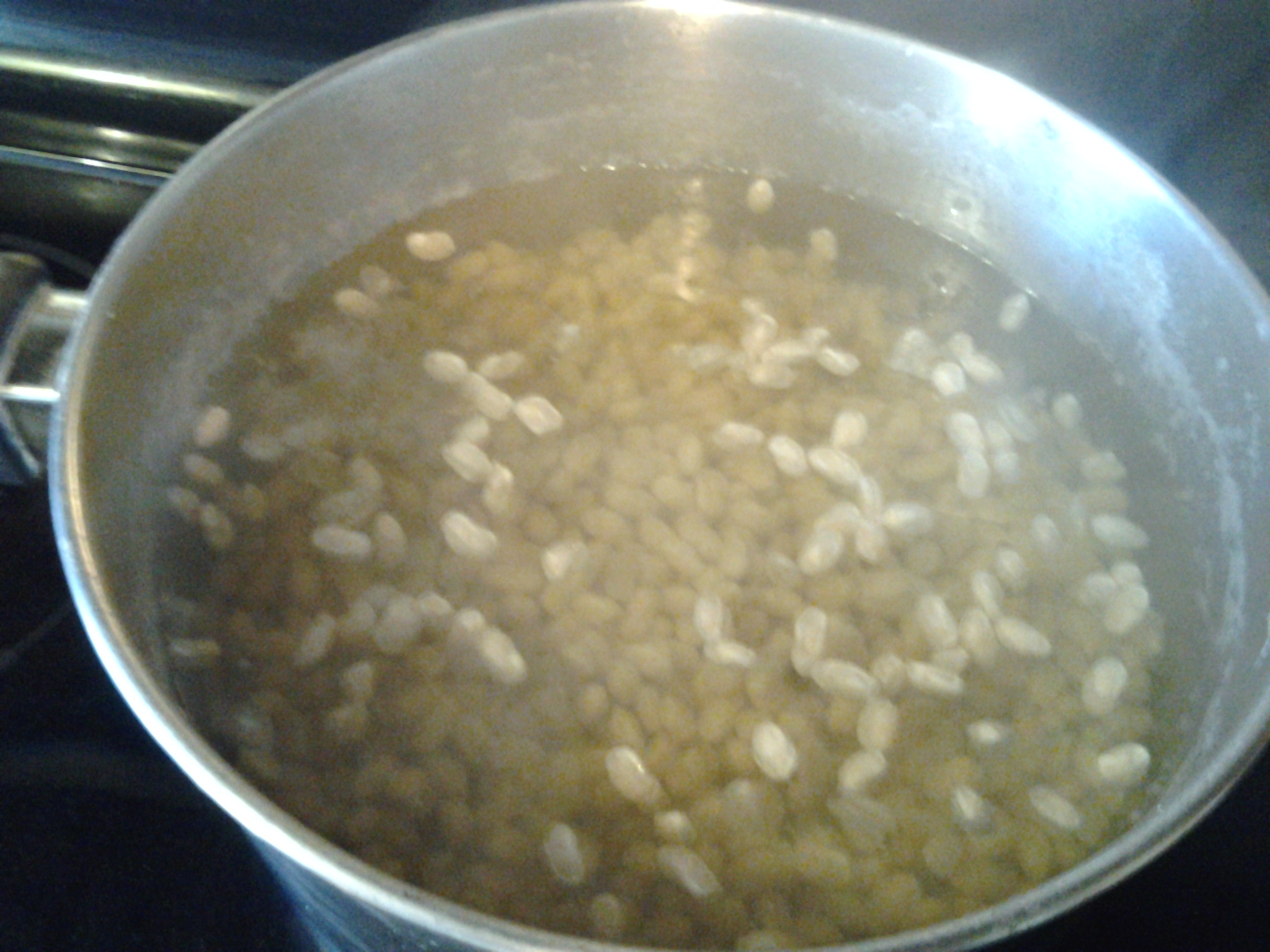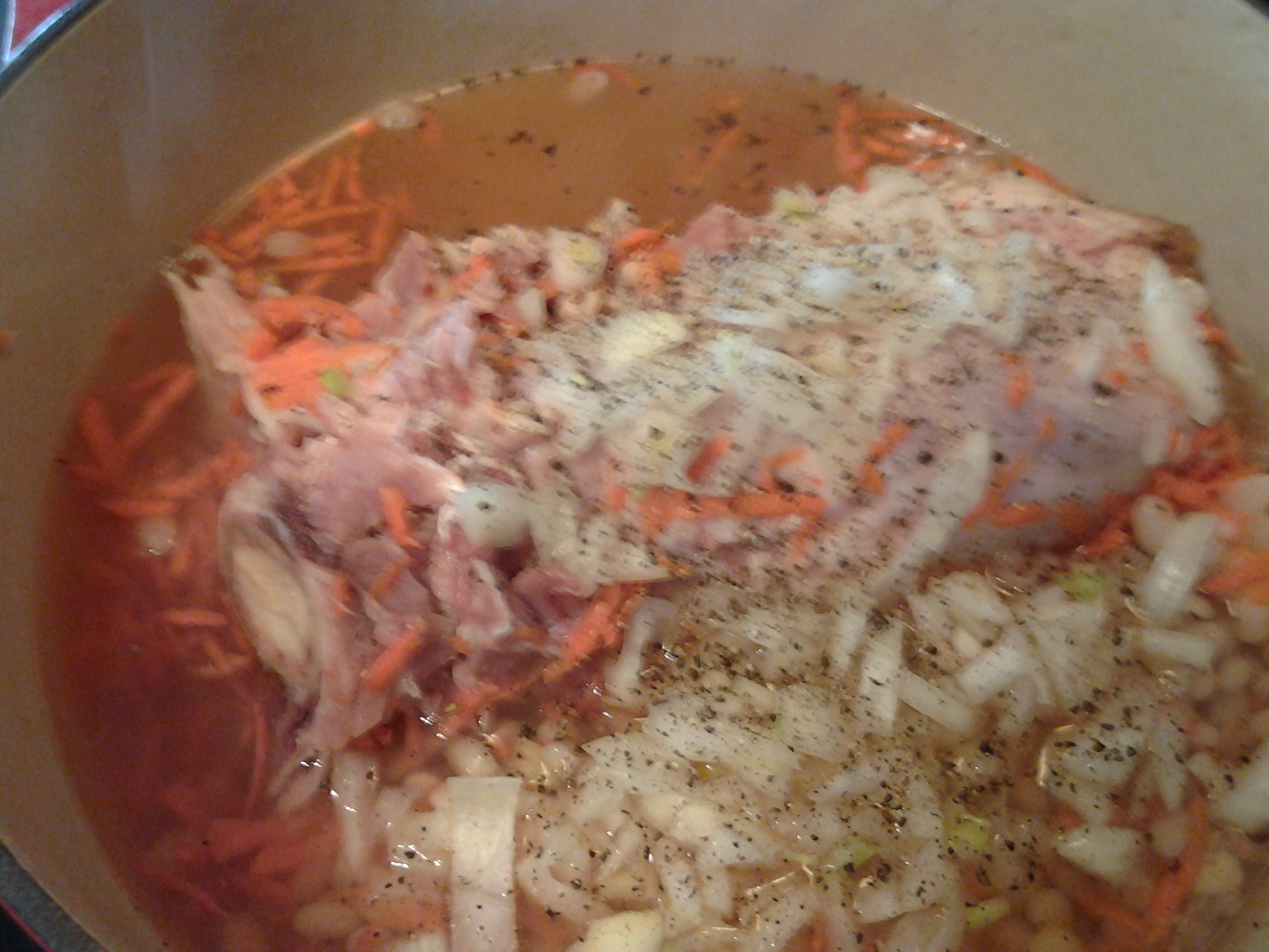 In large dutch oven or pot, place ham bone, beans, (shredded/diced/sliced) carrots, finely diced onions, enough water to cover, “little” salt, plenty of fresh cracked black pepper, Goya Ham Seasoning &/or Better Than Bouillon ham or vegetable base (optional).