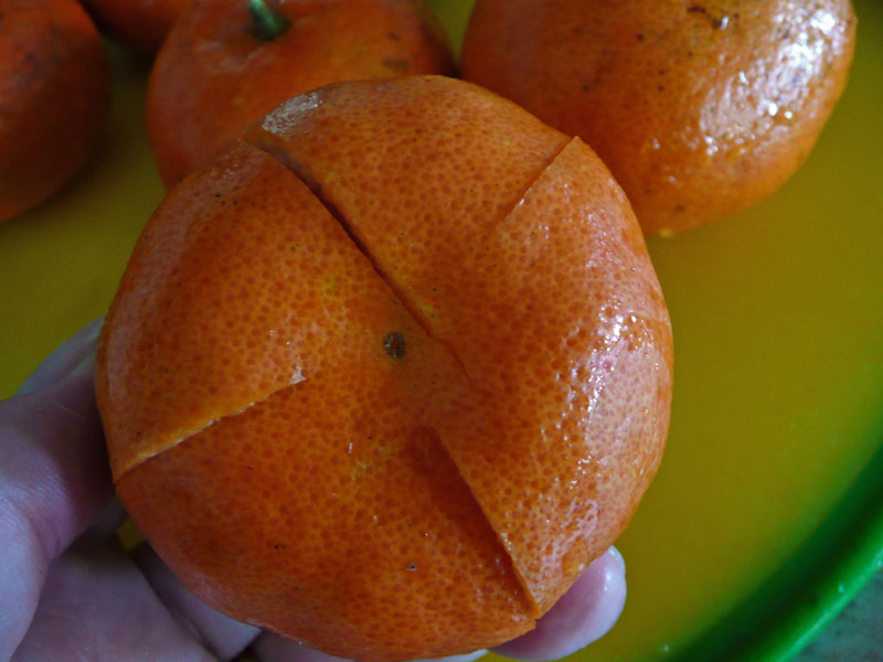 2. With a sharp knife make 4 cuts down the length at quarter intervals, leaving the ends intact. The cuts should go right through, so if you depress both ends it opens like a lantern.