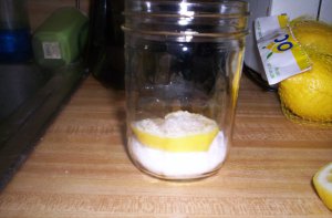 Place a slice of lemon on top of the salt in the canning jar. Sprinkle more salt on top of the slice to coat.