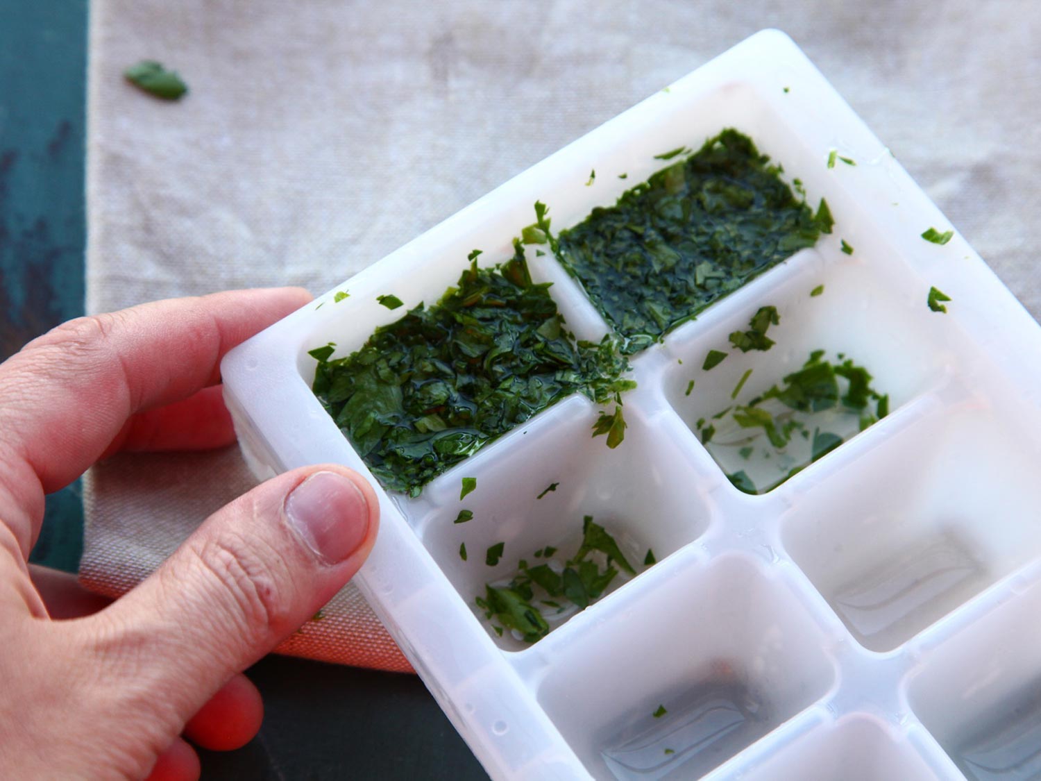 For my money, covering chopped herbs in a neutral oil and freezing them solid is the best method to keep your fresh herbs tasting fresh for a long time. To do it, place chopped herbs in an ice cube tray, then top up the wells with a bit of neutral oil like canola or light olive oil. Alternatively, if you have lots of herbs, place the whole leaves in a food processor, add a few tablespoons of oil, and process until finely chopped. Transfer this mixture to an ice cube tray and freeze.Once frozen solid (this will probably take overnight), transfer the cubes to a zipper-lock bag for long-term storage. Use cubes of herbs wherever you’d add chopped fresh herbs to a cooked meal, such as in soups, stews, or pan sauces. Even directly out of the freezer, an oil-based cube of herbs will soften and melt much faster than a ice cube of equivalent size.