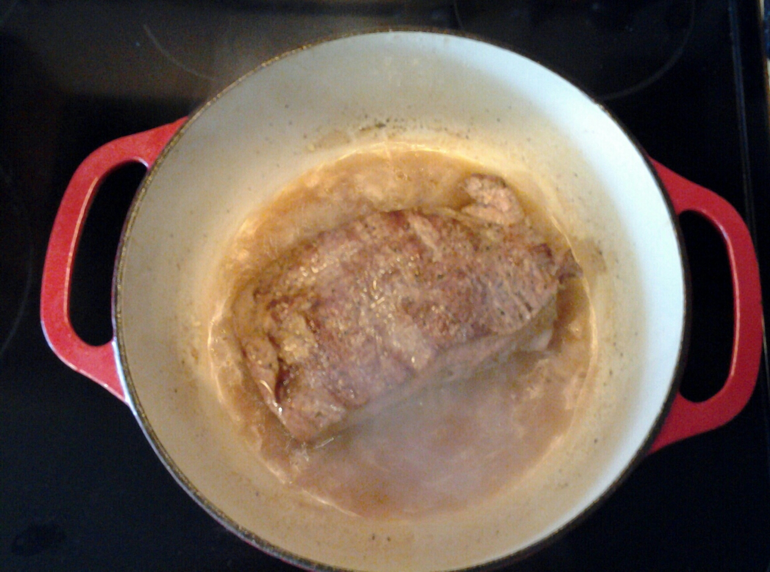 9. Add the meat and mushrooms and remaining broth. Cover and simmer for 50-60 minutes until the meat is tender.
