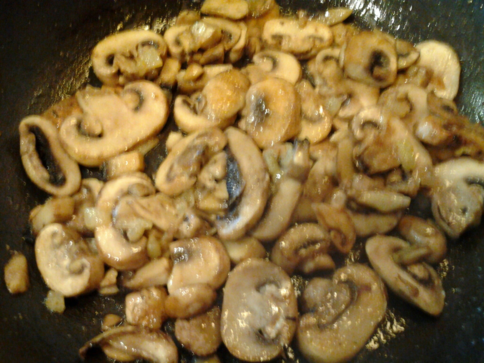 3. In a large, heavy skillet or pan, melt 2oz of butter on medium heat. Sautee the mushrooms with a dash of salt and pepper for about 5 minutes, or until they are nice and golden brown and their liquid has been released and cooked off. Remove and place in a container to the side.