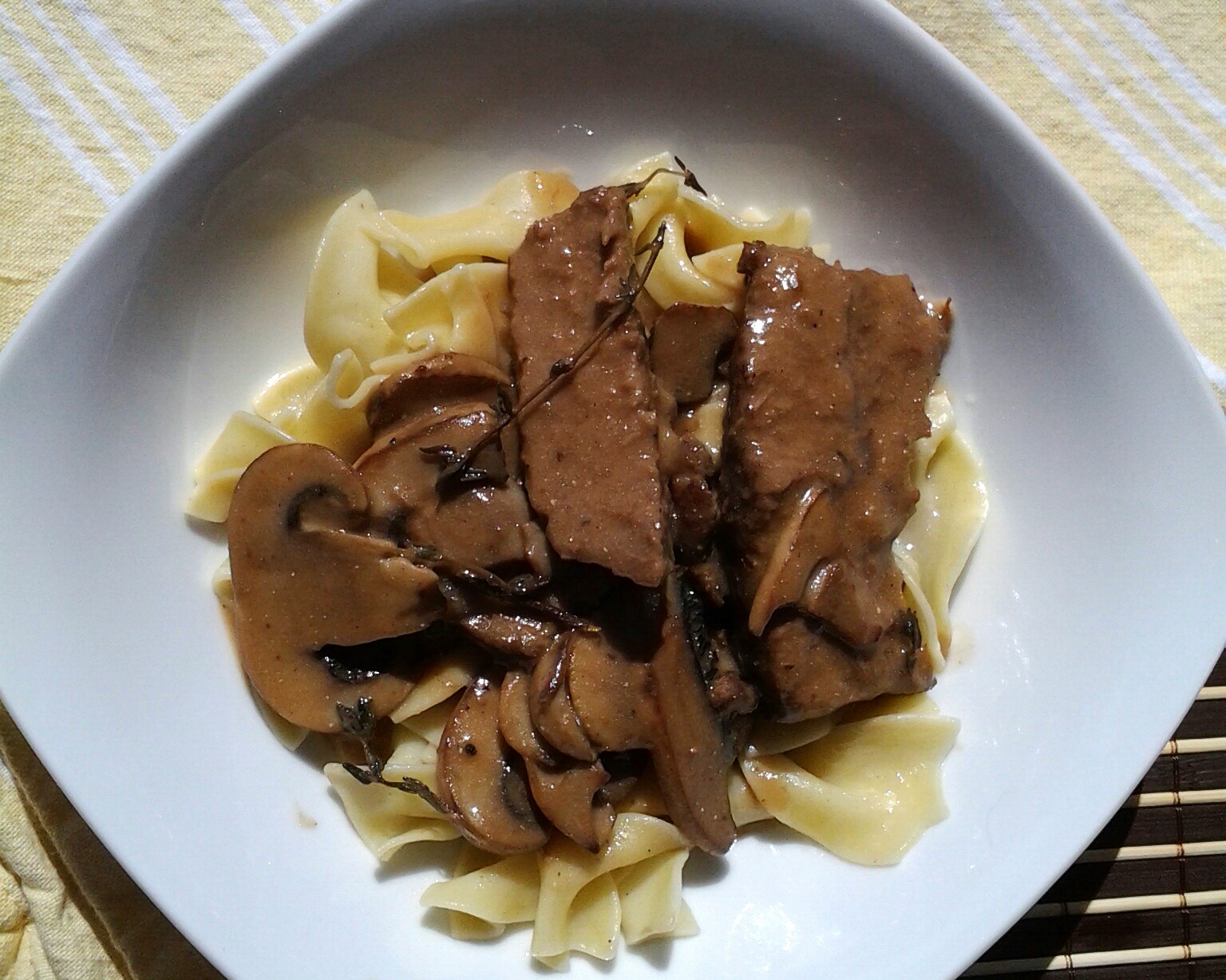 11. Check seasoning, dalt and pepper to taste, serve over wide flat noodles.