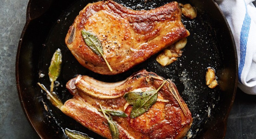 Saute the sage and garlic for a minute, then add the chops and brown well on both sides.