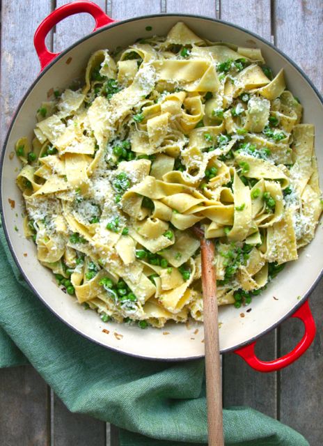 When I received the May issue of Martha Stewart Living, I earmarked every pea recipe- they all sounded so delicious!! I picked this buttery, sweet, rich, and easy dish to try first. (We also can’t eat enough pappardelle in my house!) My son declared that it was “addictive.” 🙂 It was absolutely DELICIOUS. This recipe was adapted from Martha Stewart Living.