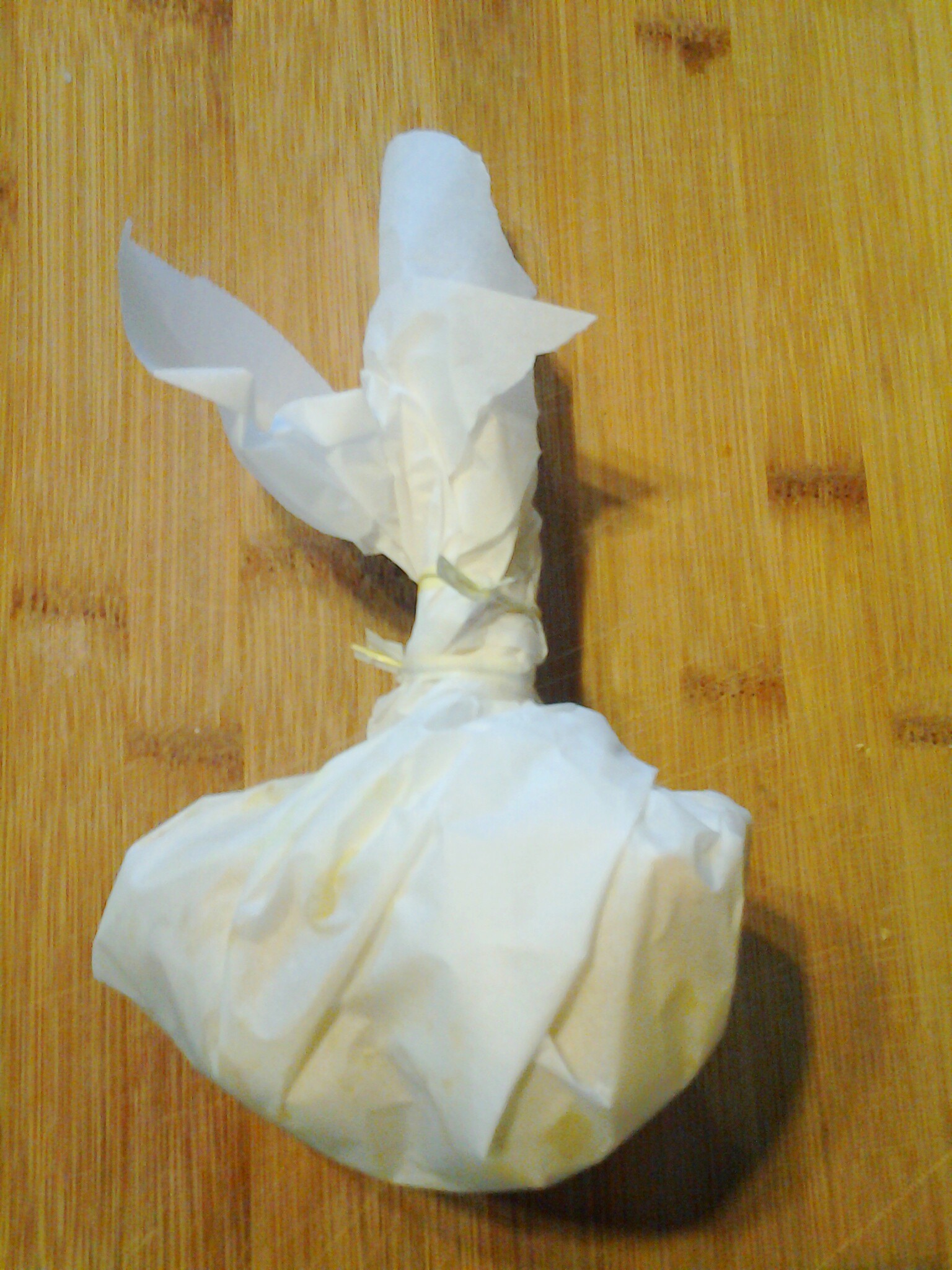 I didn’t have a foil, nor a little baking dish.. so I used parchment paper, with a twist tie. It worked!