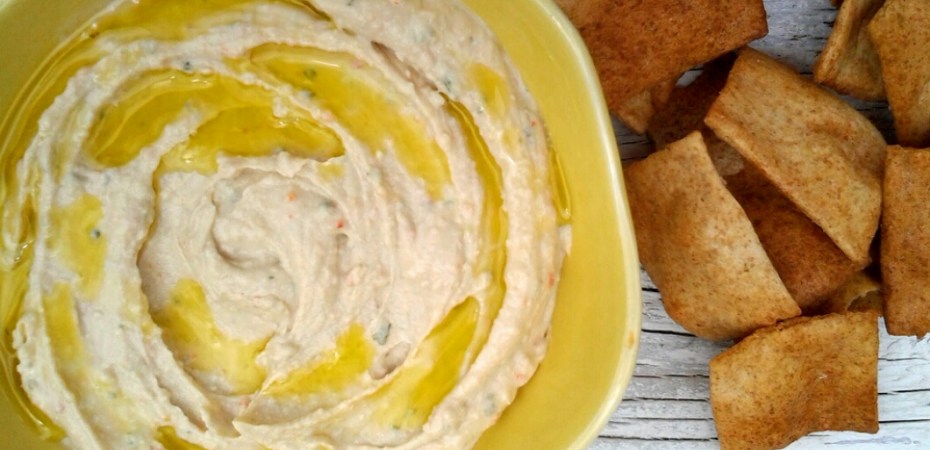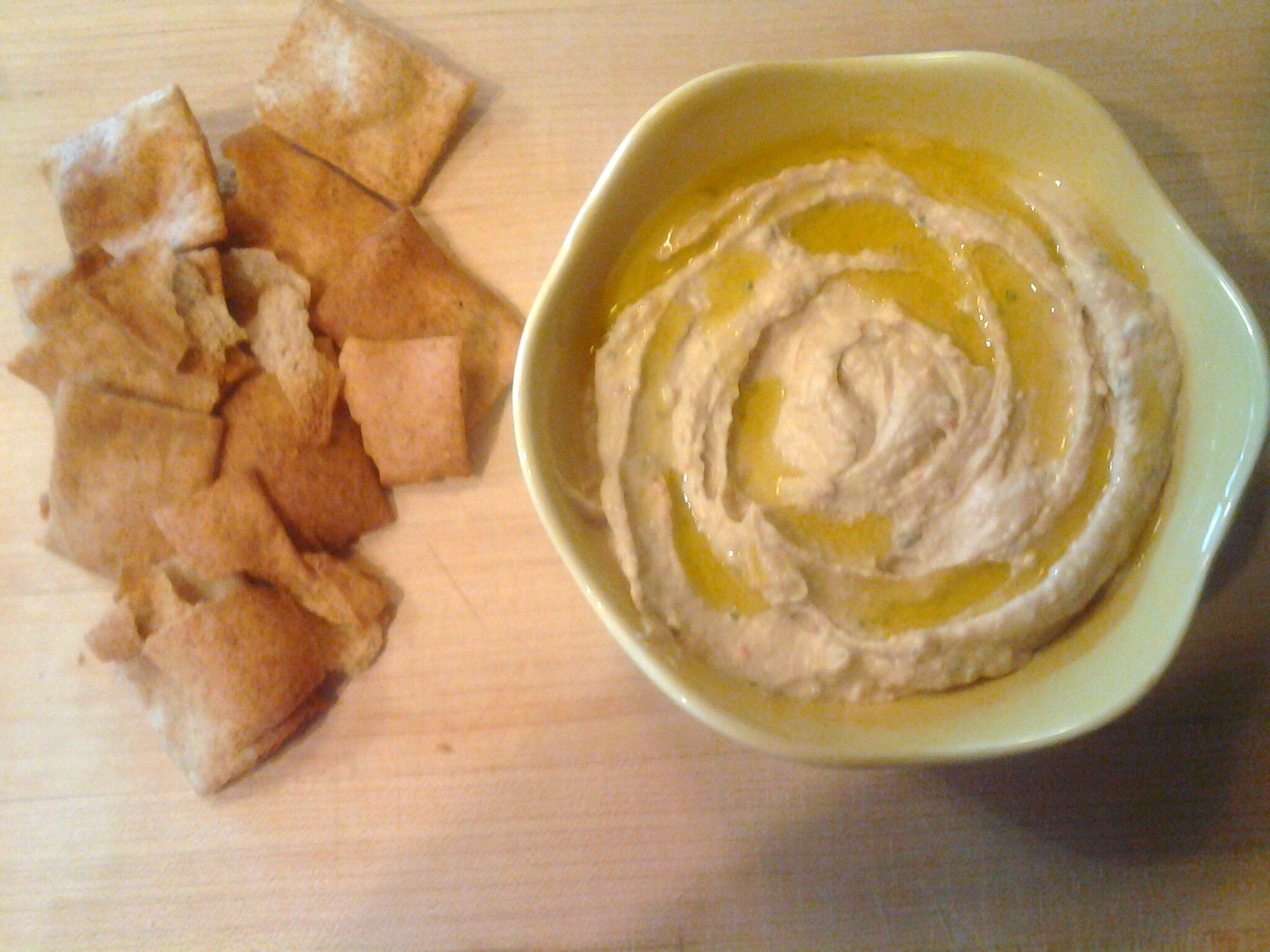 Hummus made with white beans… that’s what I made today; Along with some crispy fried pita chips. YUM!