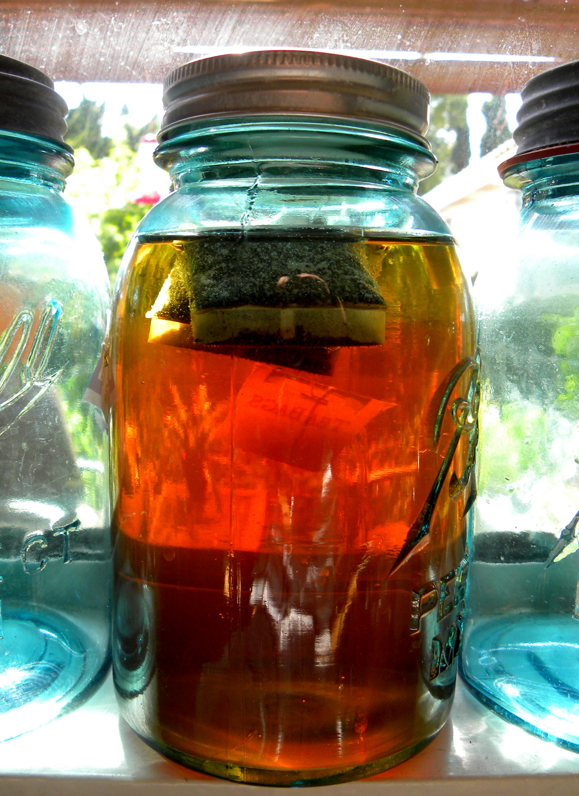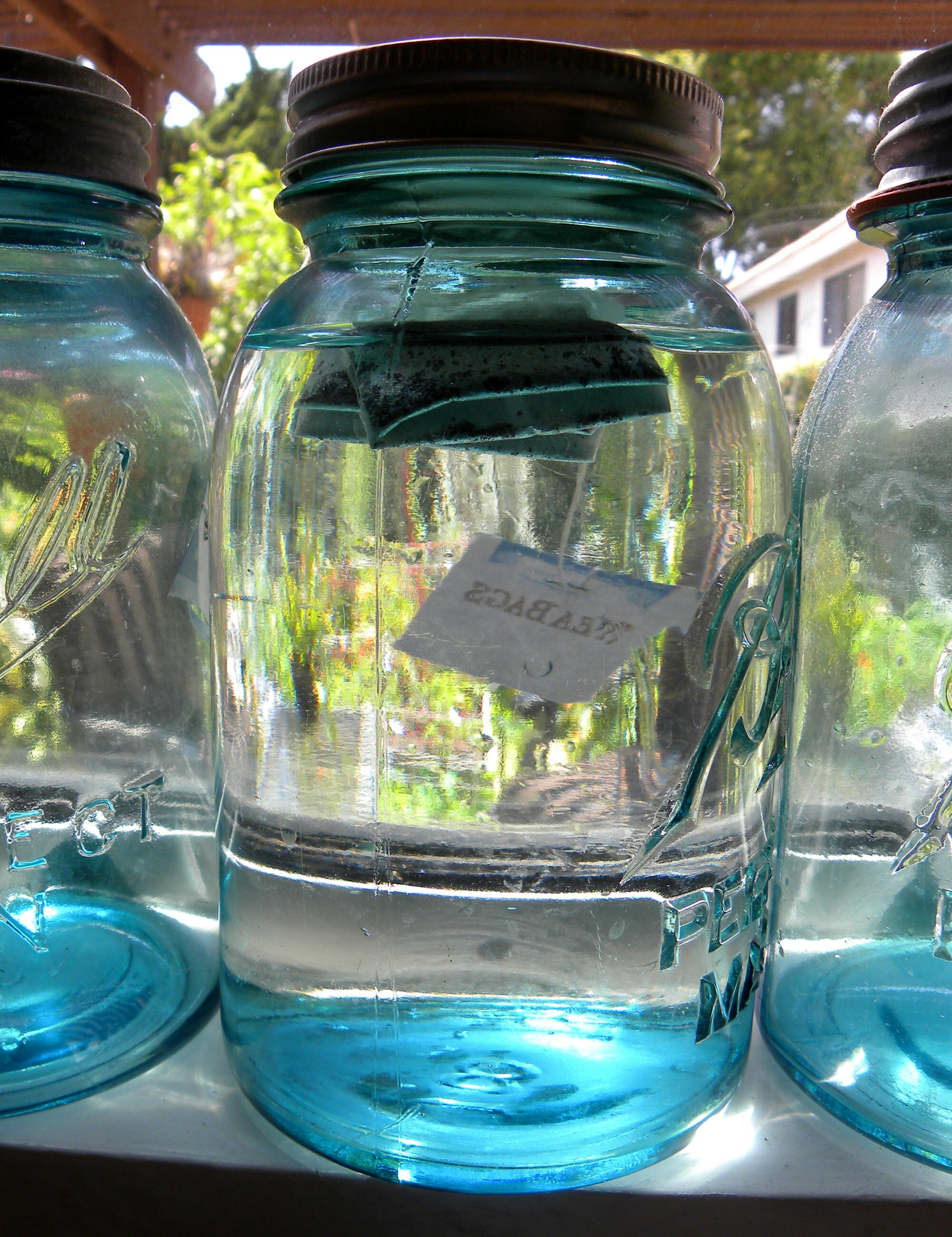 Fill the jar with room temperature tap water. If you want to take out the organics and chlorine, you can use water that has been through a Brita filter. Not necessary, but again, I think it tastes better. Add two tea bags. Let the jar sit for a couple of hours. It doesn’t have to be in the sun at all. I love the way the afternoon sun filters through the blue jars, so I set mine on the windowsill.