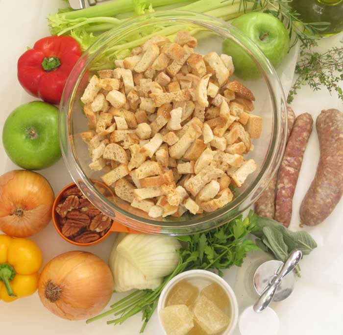 This holiday turkey stuffing is brilliant! This will stuff a 10-12 lbs turkey. The Fresh Crush Rosemary Olive Oil adds a delicate aromatic touch.