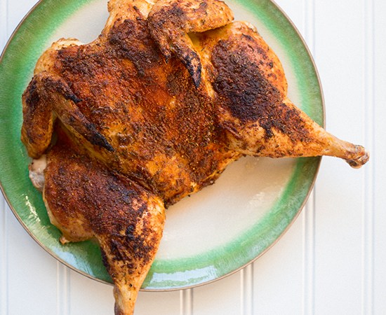 This spice-crusted chicken dish makes use of clarified butter to prevent burning while roasting at a high temperature. Spatchcocking the chicken ensures that it roasts quickly and evenly.