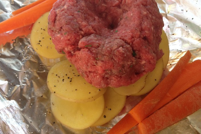 Heat grill or oven to 375°. Layout 6 heavy duty foil squares & place 2 halves of bacon in the center of each square.In a large mixing bowl, combine meat and seasonings. Divide meat into 6 equal portions, form patties and set aside.Arrange potatoes atop bacon ((don’t stack the raw potatoes or they won’t cook through)). Next, arrange carrot sticks around the bacon. Place the meat patty on the potatoes and top with the onion slice and a dash of seasoned salt and freshly ground pepper.Seal the pouches and place on a cookie sheet in the oven or directly on the grill. Cook approximately 30 minutes.Serve pouches while still sealed. Half of the fun is each diner opening their very own pouch!