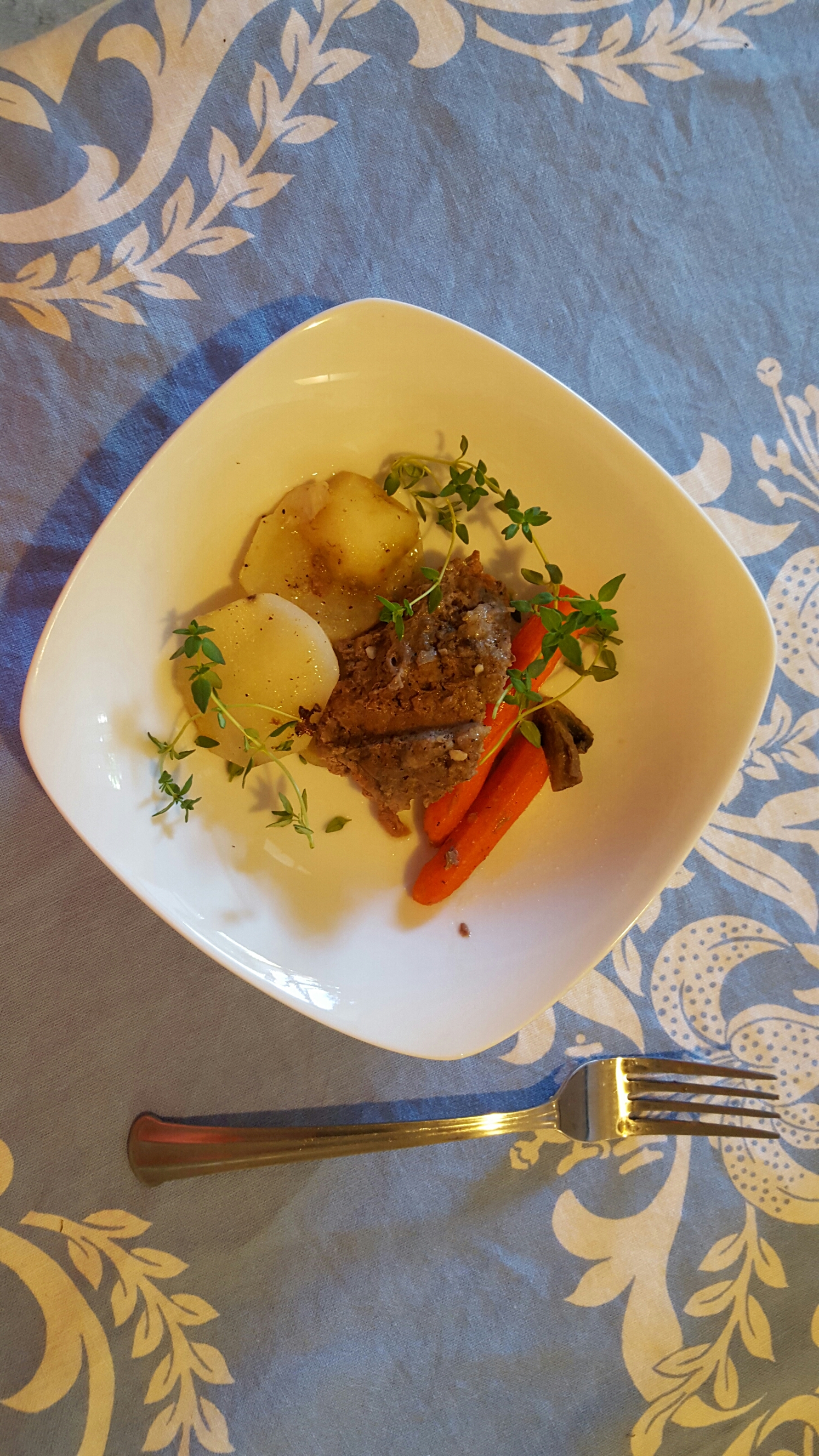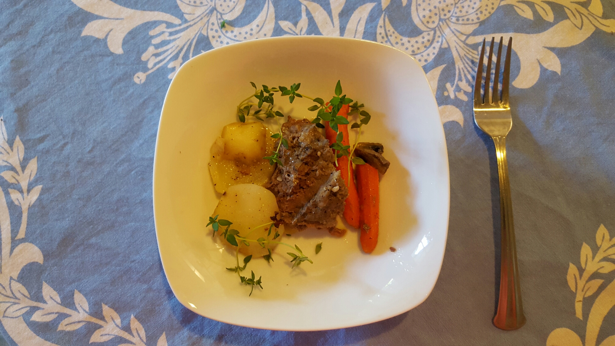 Pretty basic; ground beef, potatoes, carrots (not baby carrots) & onions…made ours in the oven.