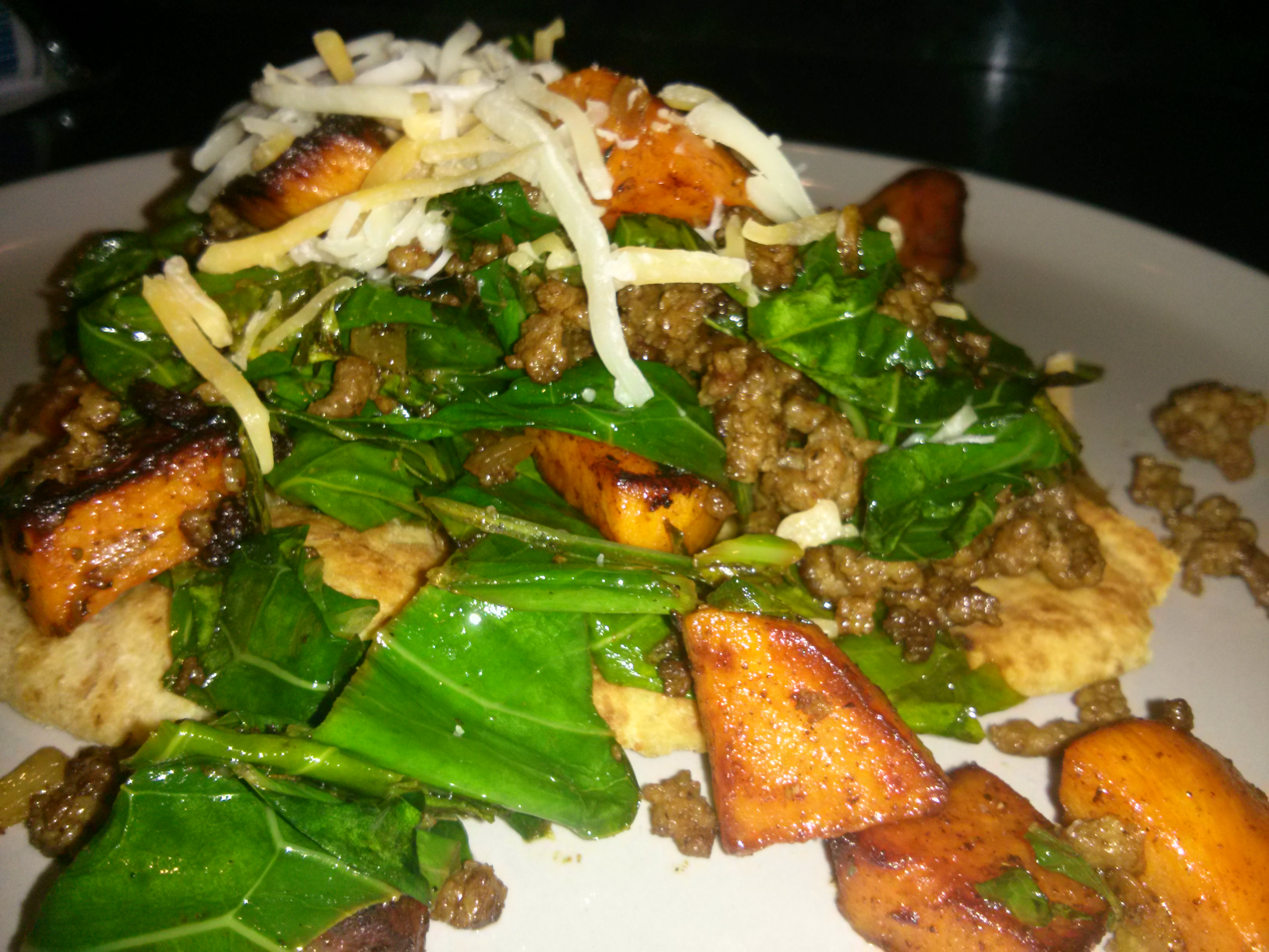 I had collard greens and sweet potatoes left over from my last Palmetto Organics delivery and some ground pork in the freezer. So I just sort of combined it all with a few of my favorite flavors: chipotle chile powder, garlic and onion.