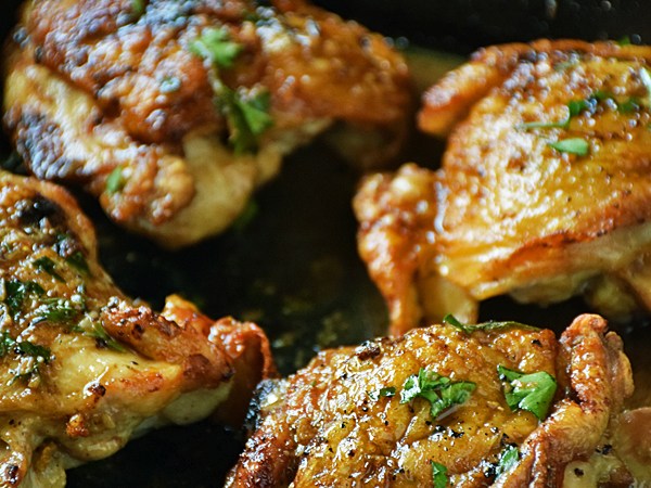 Heat a cast-iron skillet over mid-high heat. Get it good and hot and then place the seasoned chicken thighs, skin-side down, into the dry skillet. Sear the chicken, without moving, for 5-6 minutes until the skin gets nice and crispy. Once the skin is crispy you’ll be able to easily lift the chicken from the pan without sticking.