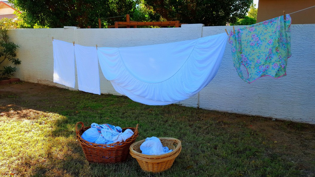 When I bring my clean bedding in off the clothesline and make my bed….it’s so SO fresh…scent and feel; like lying on a cloud. I immediately remember me and my “sister-by-choice” Lynnette twirling in my pool (in Tucson the first day home from my first brain surgery); when we were singing “I’m in heaven…” ♫ ♪ ☮