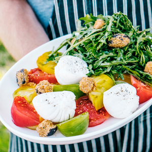 eirloom Tomato Salad with Arugula, Burrata, and Eggplant Croutons