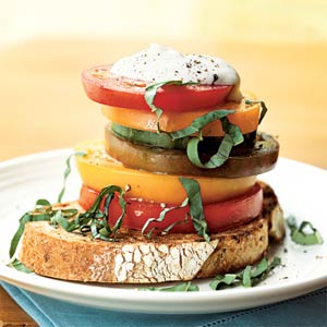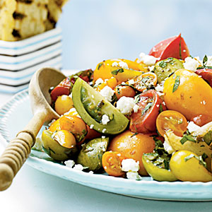 Use a combination of your favorite varieties. We like a mix of red Brandywine, Green Zebra, and Persimmon for the beefsteak tomatoes, and Sungold, Yellow Pear, and Green Grape for the cherry tomatoes.