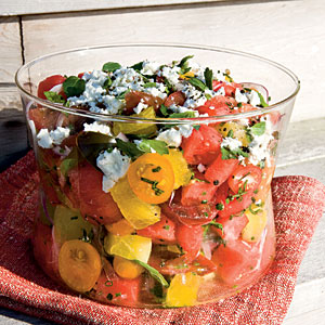 This gorgeous watermelon, tomato, and feta salad pops with color and flavor and is perfect for summertime meals. You can use any combo of fresh herbs; we like a mixture of mint, basil, parsley, and chives.
