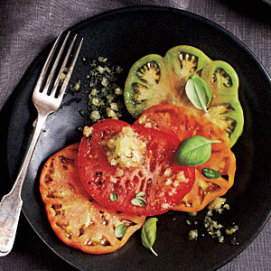 Use a combination of your favorite varieties. We like a mix of red Brandywine, Green Zebra, and Persimmon for the beefsteak tomatoes, and Sungold, Yellow Pear, and Green Grape for the cherry tomatoes.
