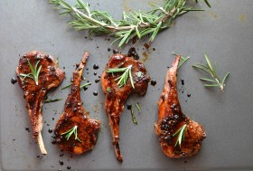 Heat olive oil in a fry pan on high with your rosemary sprigs, and place each chop down, sear both sides.