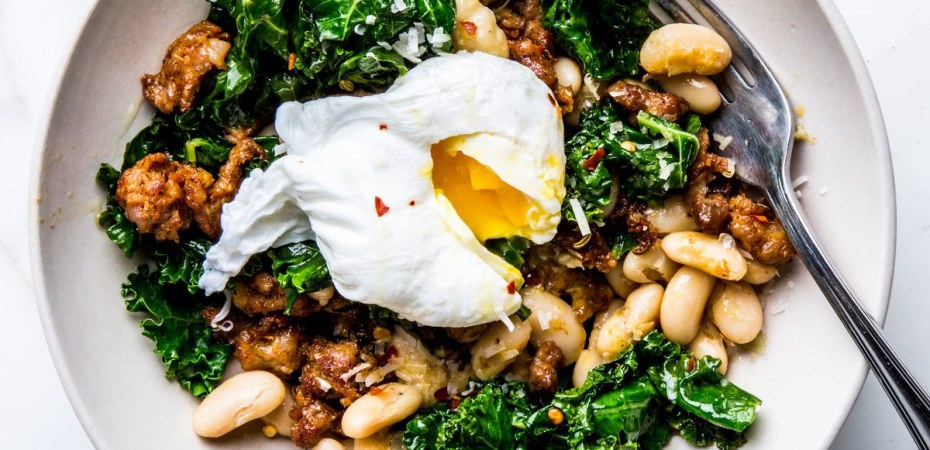 Drain and rinse one can of white beans (we use Great Northern or cannellini). Remove two to three sweet Italian sausages from their casings and crumble into a nonstick skillet with some olive oil over medium-high heat, breaking up any large pieces with a fork. When sausage is almost cooked through, about five minutes, add beans and toss until warm. If the beans and sausage get dry, add a splash of white wine or chicken stock. Add a big handful of shredded kale until slightly wilted. Top with a drizzle of extra virgin olive oil, shaved Parmesan, a squeeze of lemon, and crushed red pepper flakes, if you crave some heat. I like to mix this up in the summer by skipping the kale and topping with fresh arugulaand cherry tomatoes dressed lightly with lemon and olive oil.