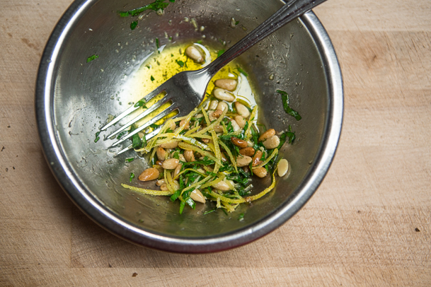 Use flat leaf parsley if available, and wash it well. Most importantly, be sure it is completely dry before you start chopping it. If possible wash and dry it a few hours before you use it and then wrap it in a towel to absorb the last few drops of water. If the stems are thin and subtle, don’t worry to much about including them. If the stems are thick and tough, you’ll want to pluck the leaves. Chop the parsley as finely as possible. Parsley adds a clean, fresh, herbal note.