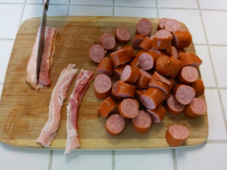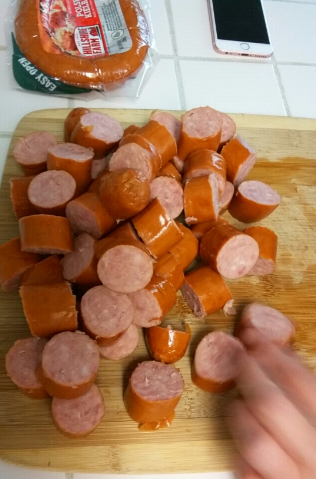 3 large links of pre-cooked sausage such as Kielbasa or Mennonite sausage (~1 1/2 pounds)