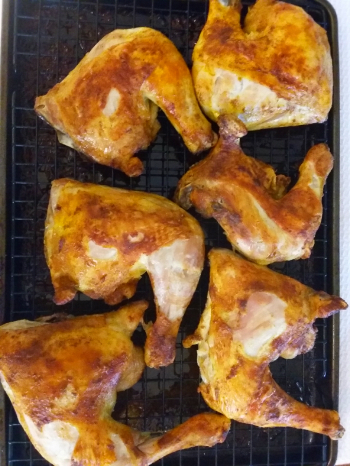 We are enjoying my latest roast chicken immensely, so I made it again without changing a thing. Roasted Turmeric Chicken, Chicken Leg Quarters seasoned w/ turmeric & your favorite seasoning! garlic powder, Seasoning Salt, sea salt. Cheapeats but so yummy.