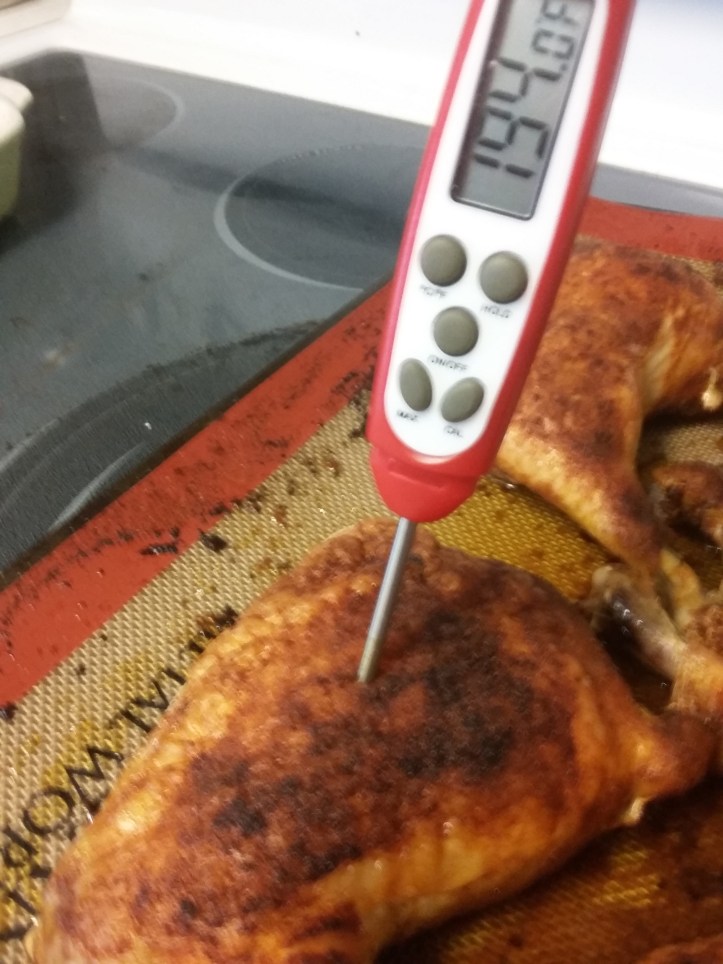 Oven on 425°, I use a silicone liner on sheet pan (parchment paper is good), season generously on both sides, put in oven skin side up for 45 – 55 minutes or until thermometer reads 165°. I baked potatoes at same time and when they were fork tender…I checked internal temp of chicken, yes it was 190° 😀 HOWEVER, it was still juicy! And delicious. By the way, I do take the pan out with pot holders and ‘slightly…slowly’ tip to drain most of juices off pan during cooking; when checking on it and I see its too much. The chicken will slide easily off silicone so I repeat “slightly tip”