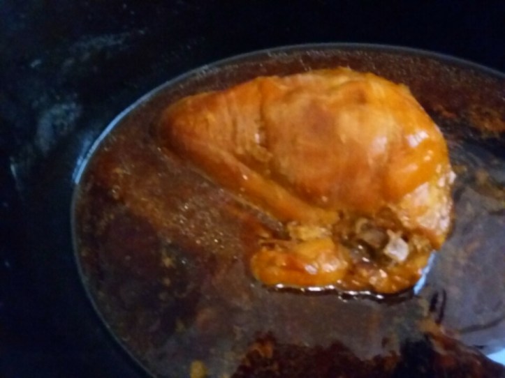 Too easy for a recipe. BUT…I put frozen chicken (I had 5 or 6 bone-in, it’s what was on sale) in slow cooker, made ‘our’ favorite basic teriyaki sauce (this sauce can be adjusted to your preference of sweet, salty, heat ‘red pepper flakes’ & acidity)…TASTE IT. –