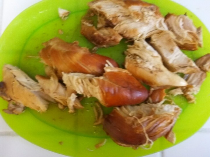 Remove chicken from slow cooker to platter & cut to desired size pieces or like I ended up doing…pulling big pieces off with tongs. I left half in slow cooker with remaining sauce so it wouldn’t dry out. Or shredded using 2 forks.
