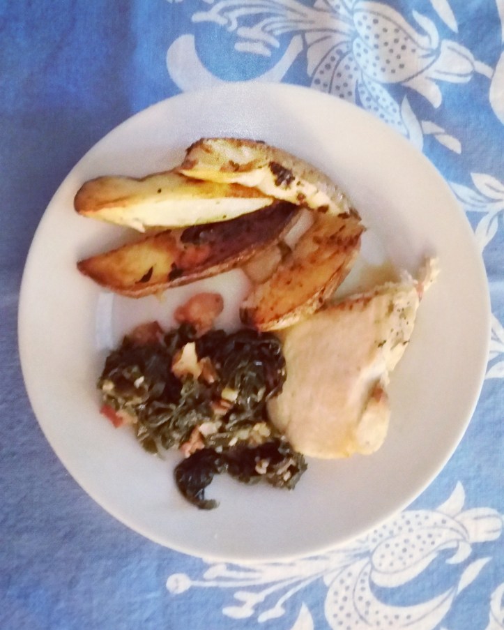 We (my daughter & son team) made a big pot of collards and baked potato wedges to go with chicken. We didn’t have ham hocks but we always have bacon, so we made them with that (1/4 lb but more bacon can’t hurt!), onions (1/2), garlic (4 cloves), chicken broth, seasoning, s&p, crushed red pepper (Peperoncino) & a sprinkle of brown sugar.
