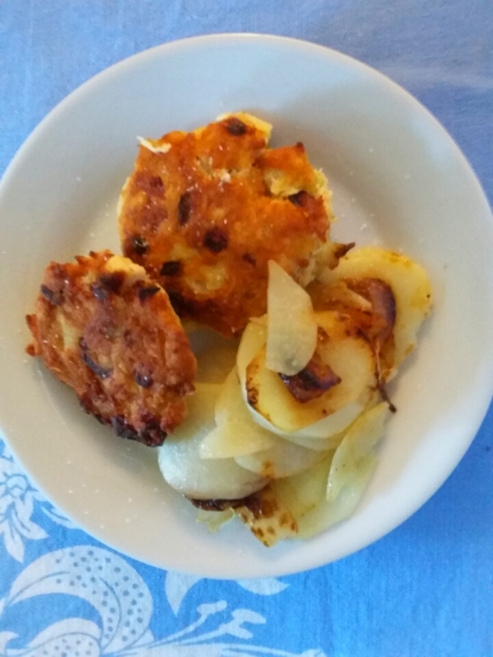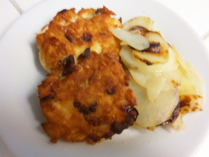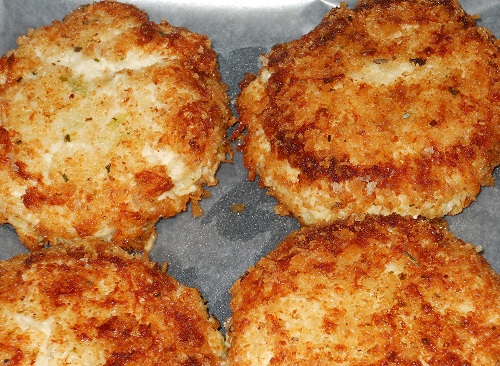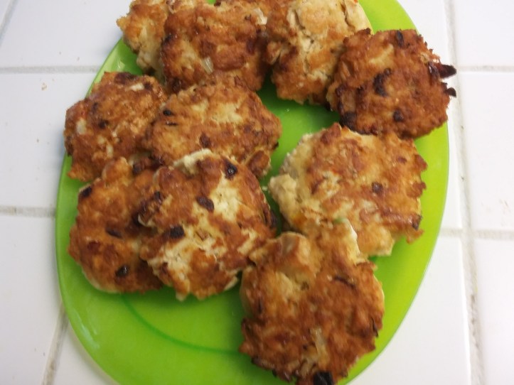This turned out to be a good idea with leftover chicken. I’ve never made them before & i have no clue why not. I tried them in a restaurant…way back in the 70’s but silly me…wanting to stay in my comfort zone. Well…no more. Everyone liked them & it’s easy. Of course made easier by my not following recipes. I decided after reading a few that they’re basically like crab cakes or fish cakes (salmon patties) and many different shapes. So I did the same, with same ingredients but with chopped cooked chicken.