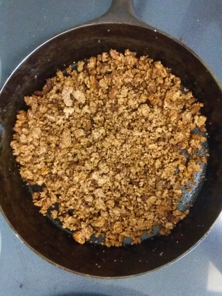 Brown ground beef, if oil left…drain. Add taco seasoning. Either a packet already mixed from store or make your own. I do both, depending on mood, what’s in pantry and/or both 😀