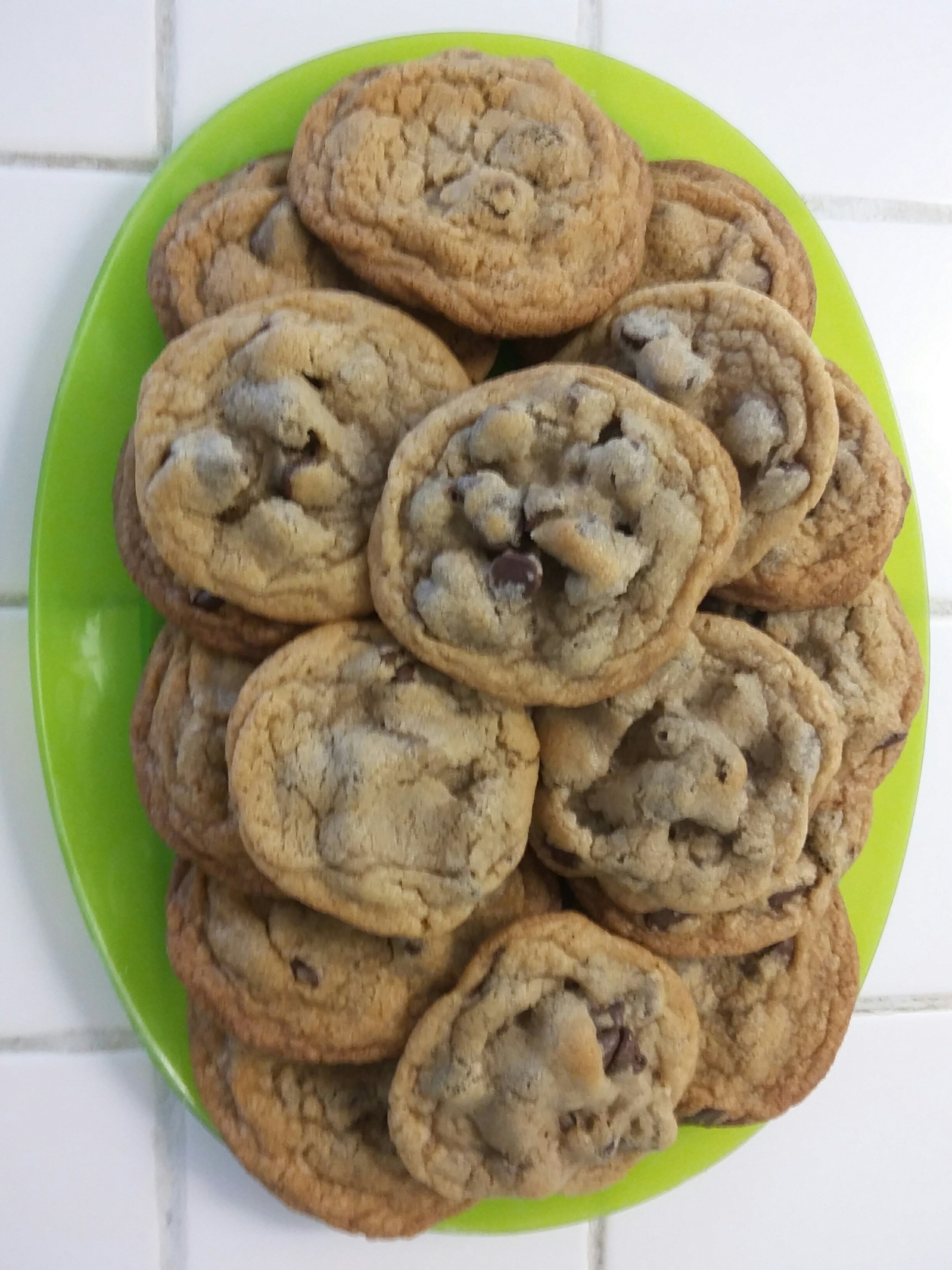 ORIGINAL NESTLÉ® TOLL HOUSE® CHOCOLATE CHIP COOKIES except I use 1/2 cup of softened butter & 1/2 cup cisco shortening (Crisco’s Recipe at bottom). I LOVE the taste of BUTTER, but the shortening is what my mother always used, so I compromised. I’ve tried them using just one or the other and I figured out the shortening gives them a little more body BUT the taste of butter…well! Hey! When I used all butter they are thinner…so if you prefer them that way, they are delicious! I like them both. Mixing it up with shortening also saves a little money on that butter.