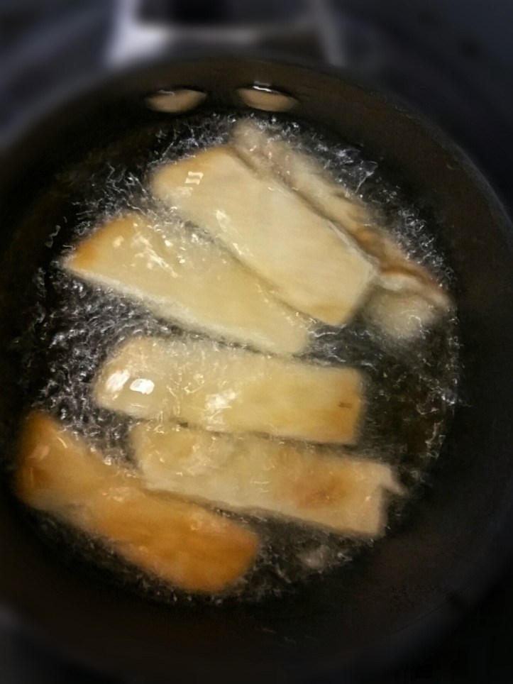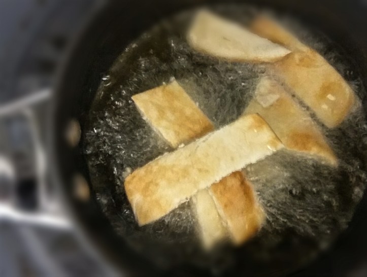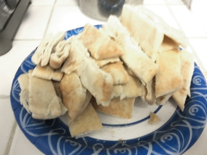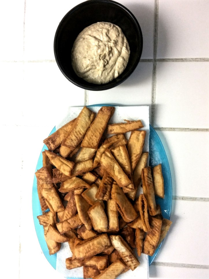 ~ cut desired shapes/strips of pita and fry until golden. Sprinkle with garlic salt.