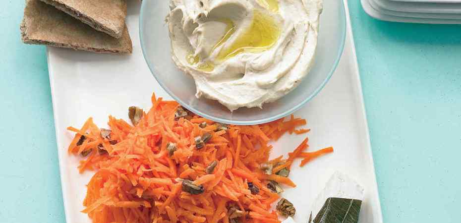 1. Reserving 1/4 cup liquid, rinse and drain 2 cans chickpeas. Place chickpeas and reserved liquid in a food processor. Add 1/3 cup fresh lemon juice, 1/4 cup tahini, well stirred, 2 garlic cloves, chopped, 1/8 teaspoon cayenne pepper, and 1 1/4 teaspoons coarse salt. Process until smooth.