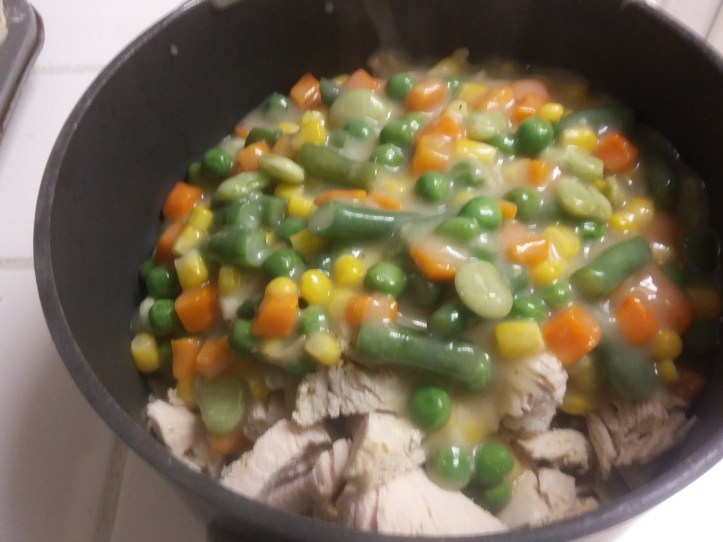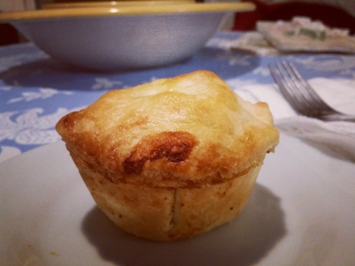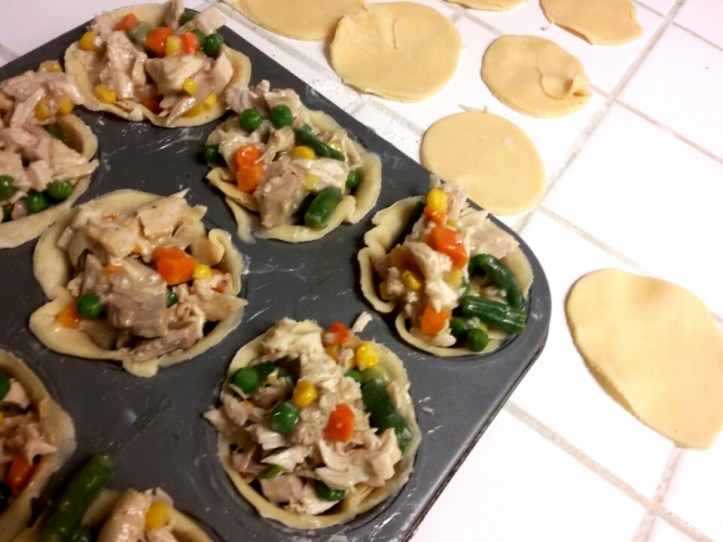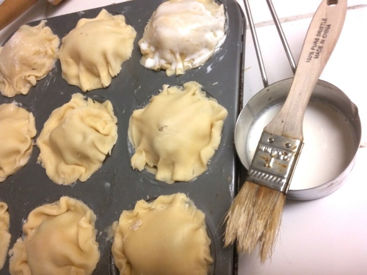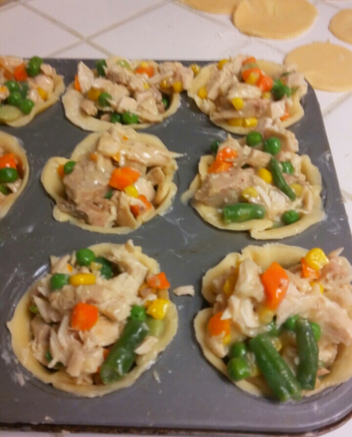 I have scrolled thru a lot of recipes due to my not measuring (lol) & i see most make a roux first, etc., I suppose that would depend on the thickness of leftover gravy. Mine didn’t need it. I simply put a couple cups of gravy in saucepan; added a couple cups each of diced turkey and frozen mixed vegetables. Heated it up, cooking while I got pie crust ready (either store bought or homemade); three 9″ pie crusts are enough for my family. You might have to roll some just a little bit more, along with scraps to make it go farther. I pressed circles of crust a size that fit into buttered, greased or sprayed muffin tin. Then filled each pie cup with filling and topped it with smaller pie crust circles. Cut slits in top crust, brushed with heavy cream.