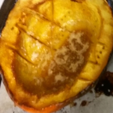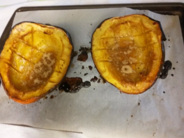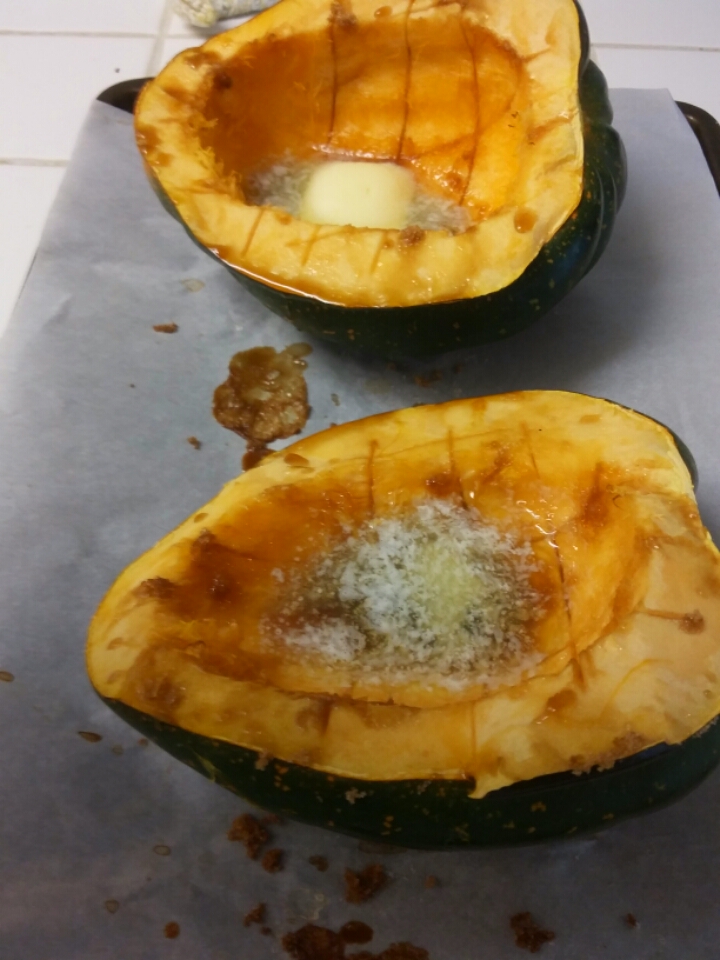 Scoop the seeds and stringy pulp out of the squash cavities and discard. I’ve always simply put butter & brown sugar in each cavity, halfway thru I use basting brush to brush it all over edges. Season with salt and pepper, to taste. Place them on a baking sheet (parchment paper makes life easier), cut side up. Bake in the preheated oven for about 1 hour until the squash is tender when pierced with a fork. Let cool a little. We scoop out what we want because no one in my family can eat a half by ourselves. And it scoops out like butter 😀