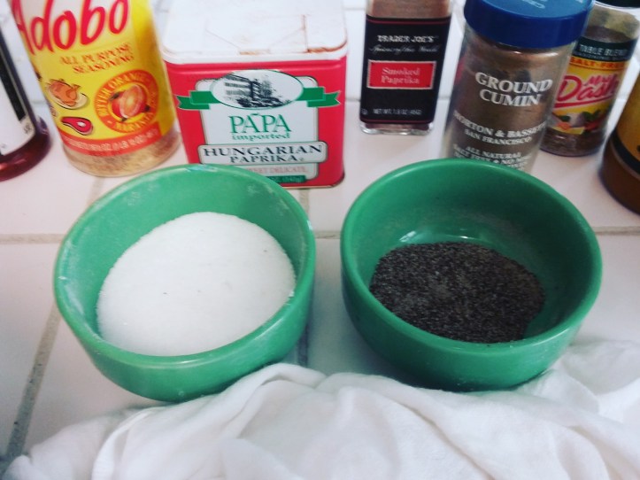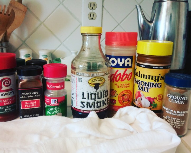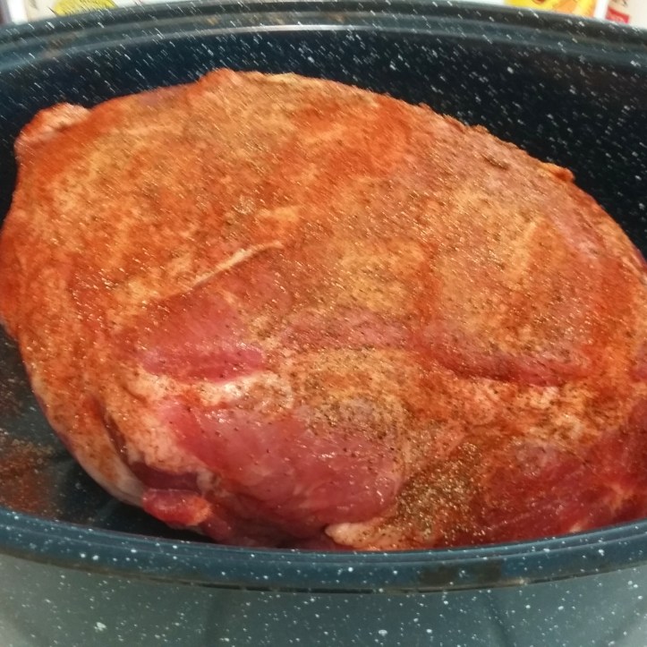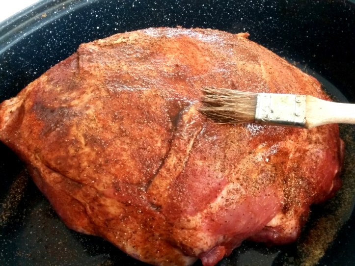 First I brushed (with pastry brush) liquid smoke all over it. Then I SEASON liberally (always put more pepper and garlic than you think you need. But not as much salt) over entire pork, you could stop at this point but I have favorite seasonings that I LOVE the FLAVOR of; so I also sprinkle with Goya Adobo seasoning (I love bitter orange), smoked paprika, cumin, Lawry’s Mediterranean seasoning (I don’t always use that one but it was calling for my attention?), onion powder, this other seasoning mix that my son likes a lot…called Johnny’s Seasoning and I sprinkled brown sugar on top
